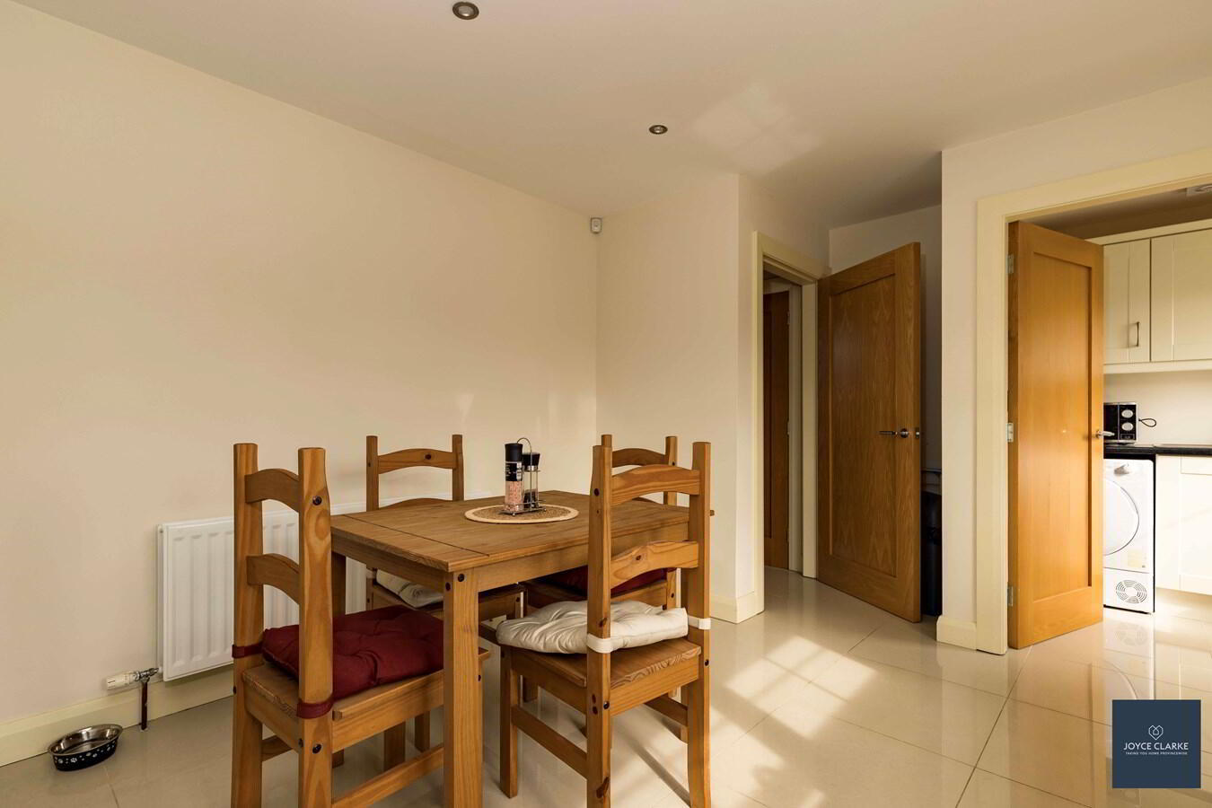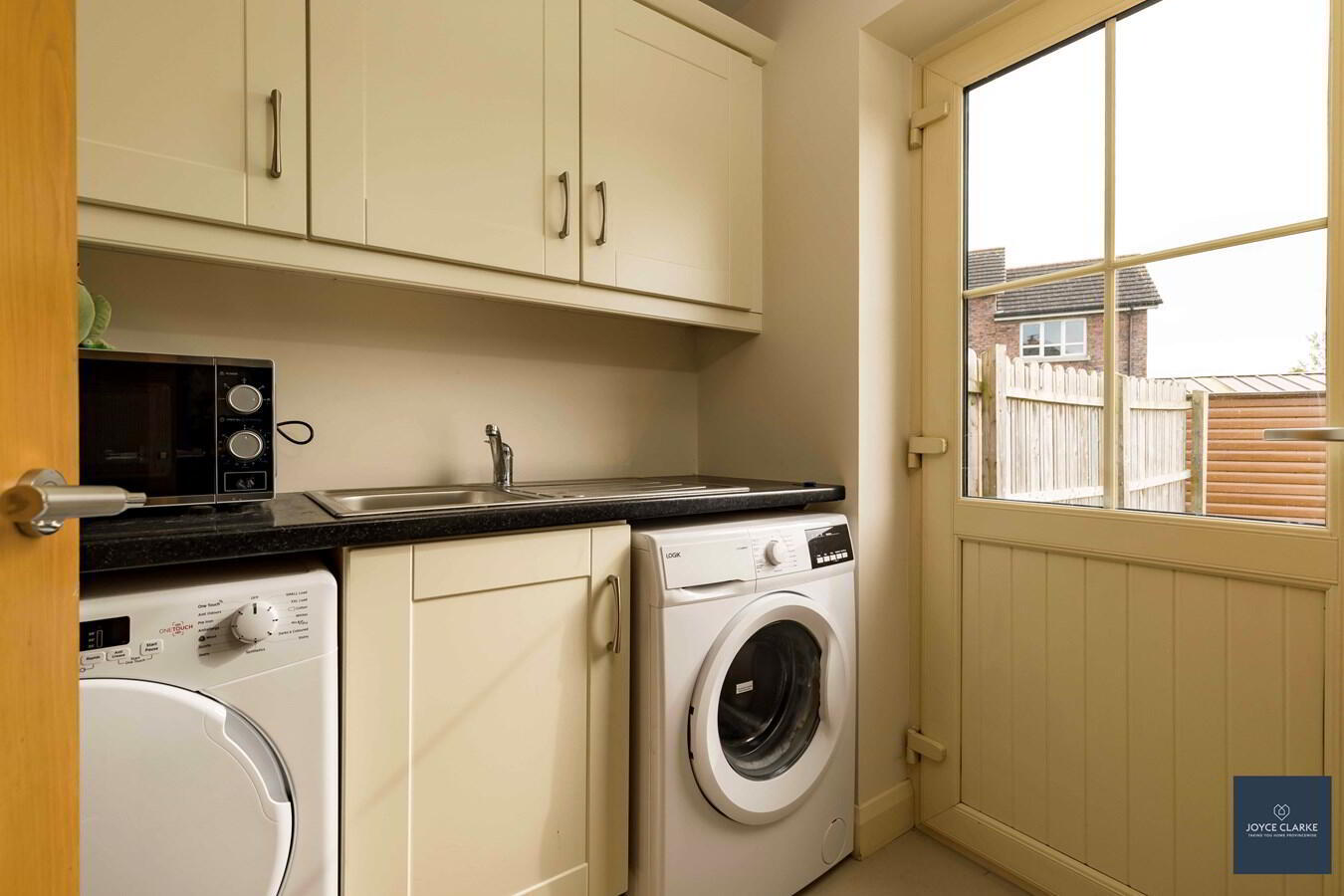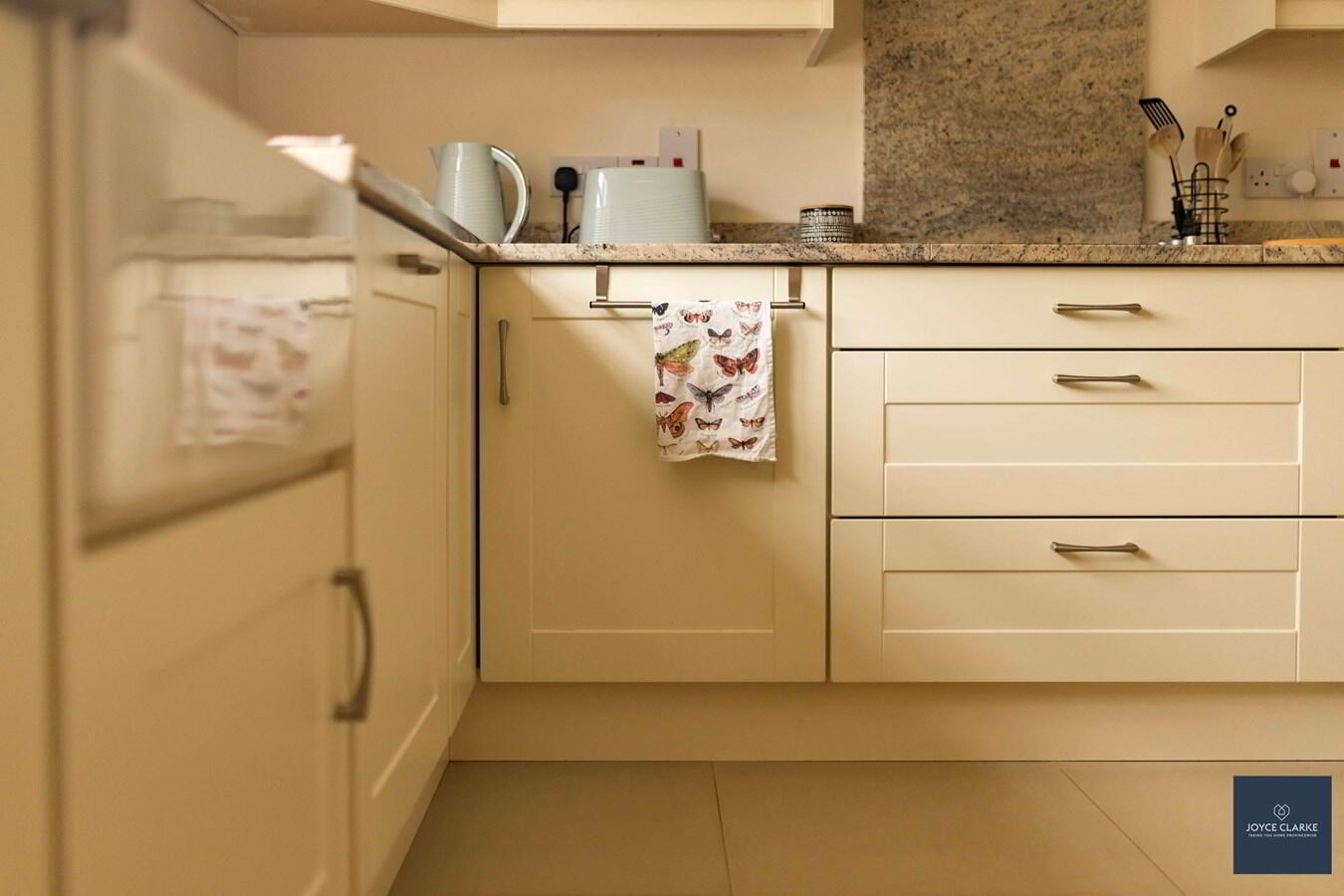 Range of high and low level storage units with a stainless steel sink and drainer. Space for washing machine and tumble drier. Extractor fan. Single panel radiator. Tiled flooring.