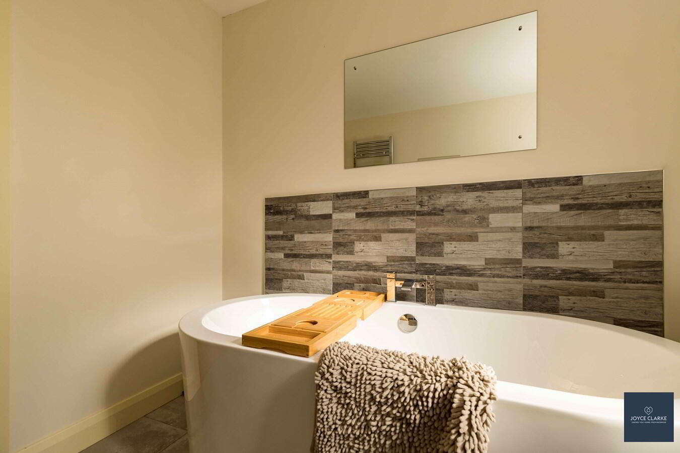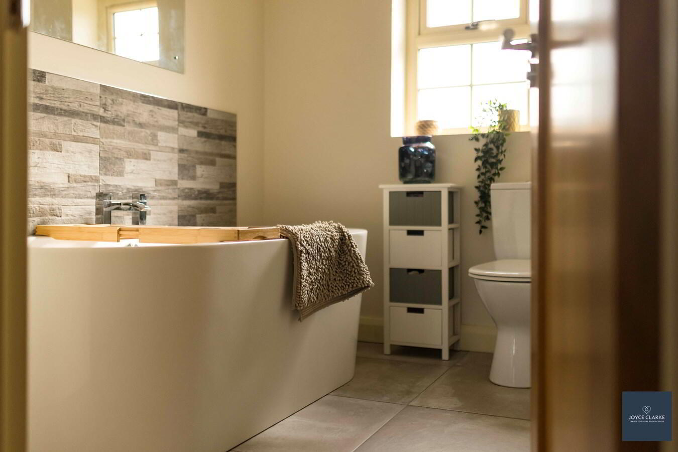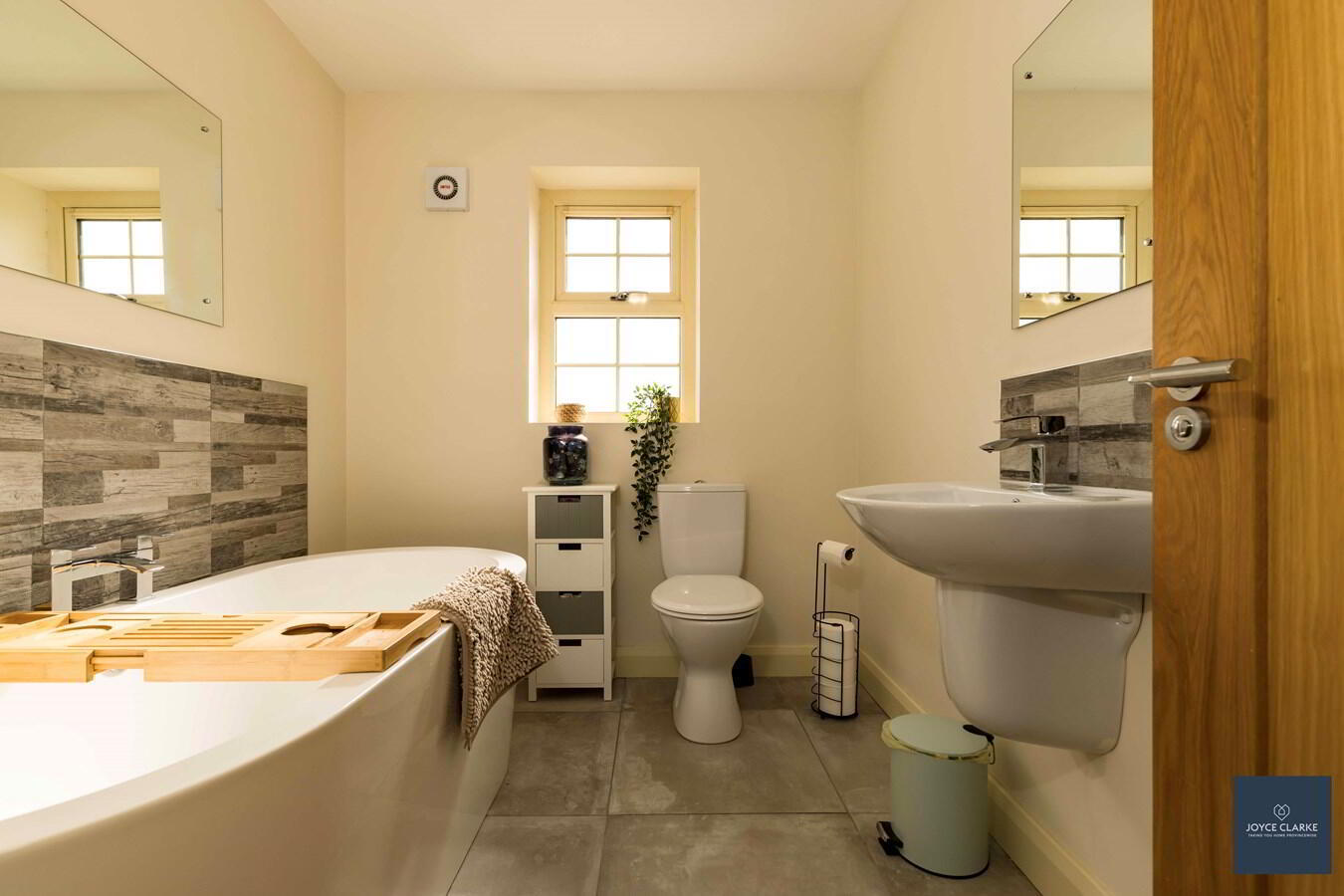 Beautiful, modern three piece bathroom suite comprising of freestanding bath with centre taps, dual flush WC and floating sink with tiled splashback. Tiled flooring. Partially tiled walls. Window. Extractor fan.