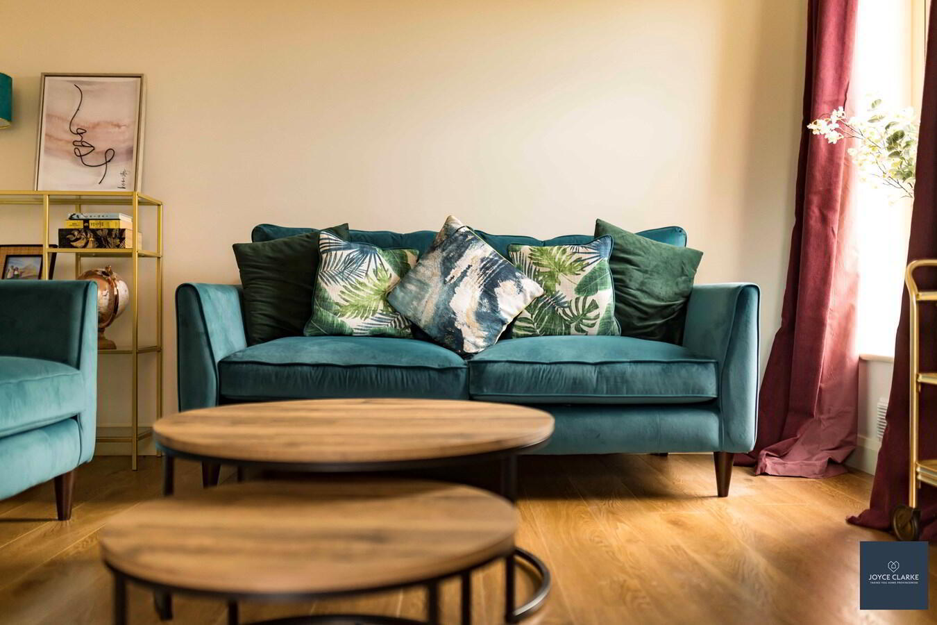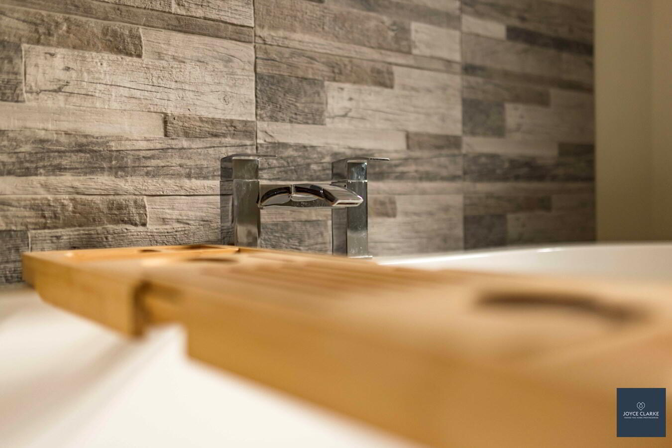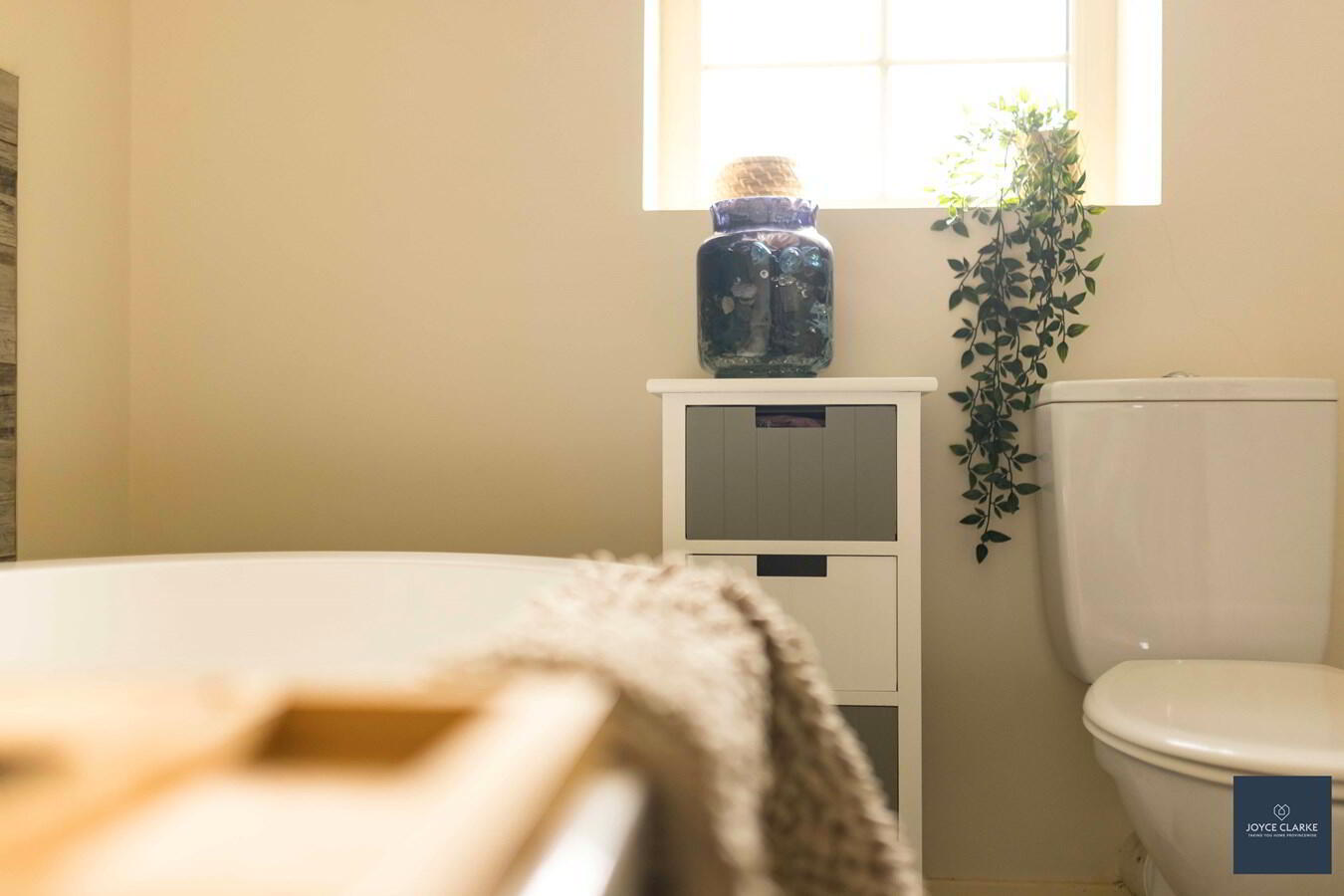 Beautiful, modern three piece bathroom suite comprising of freestanding bath with centre taps, dual flush WC and floating sink with tiled splashback. Tiled flooring. Partially tiled walls. Window. Extractor fan.