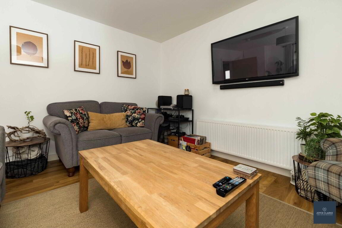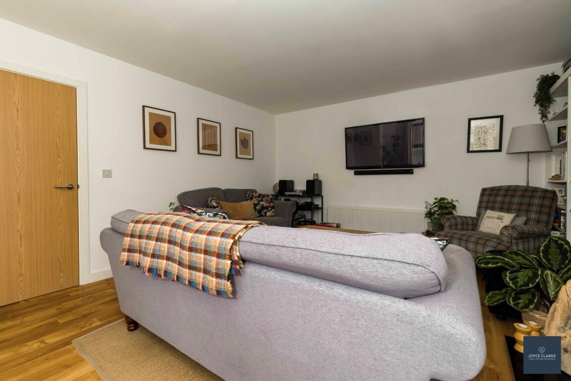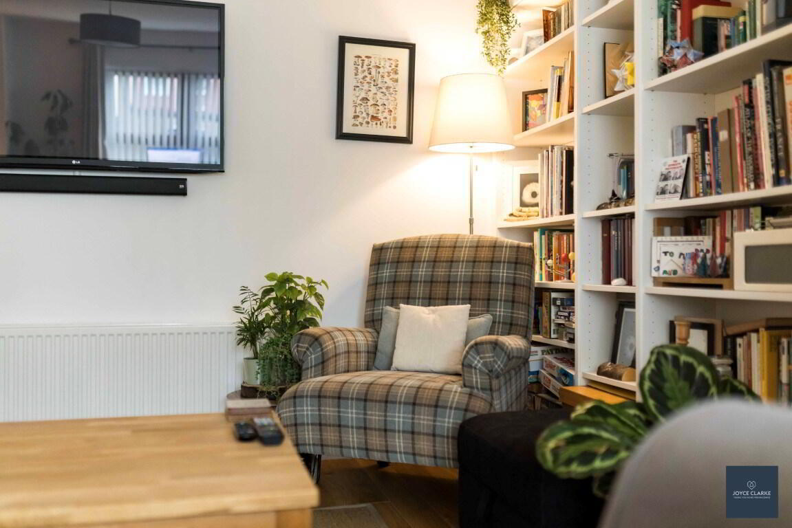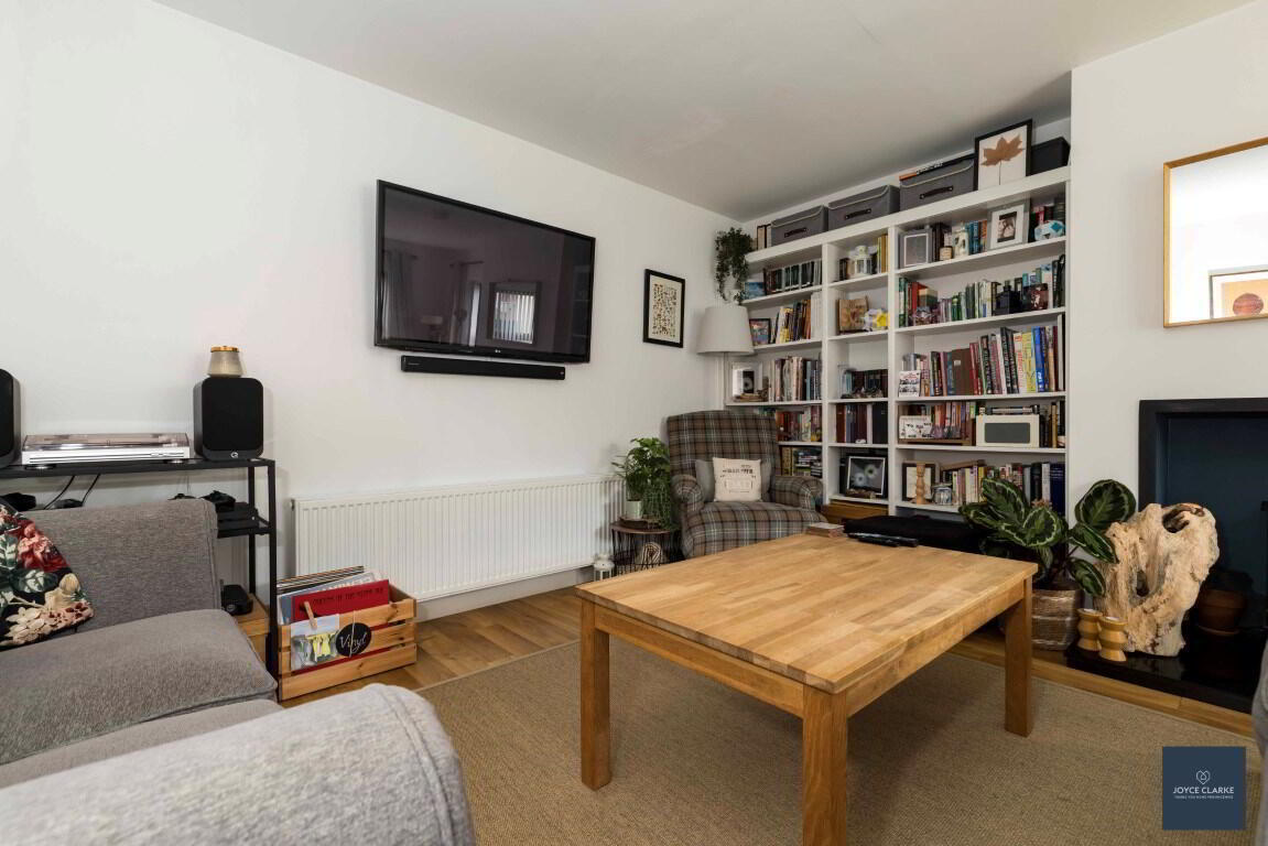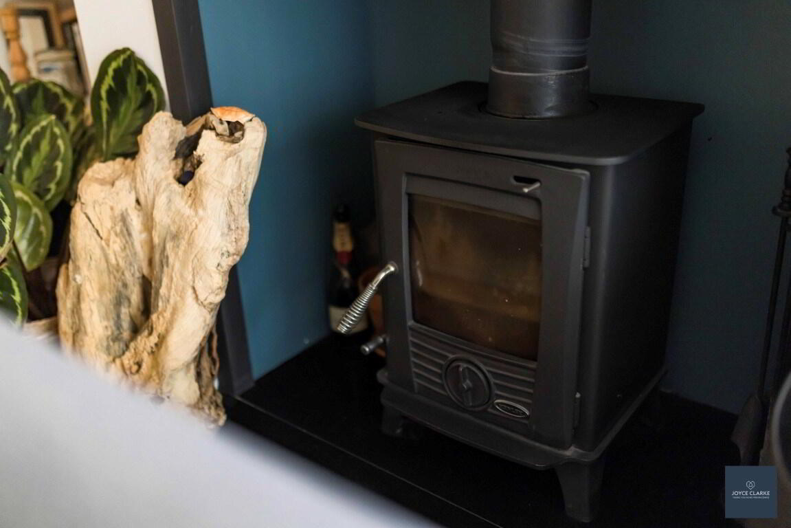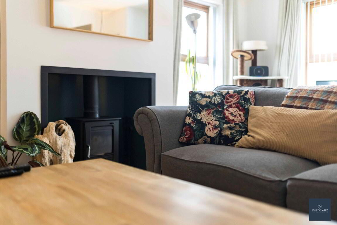 Dual aspect reception room. Bespoke book case. Double panel radiator. TV point. Multi fuel stove set upon tiled hearth in recessed chamber. Laminate flooring.