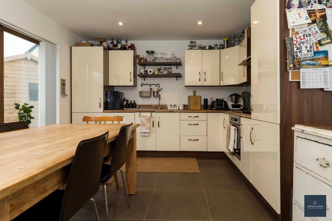 Range of high and low cream gloss storage units with wood effect work top. Integrated appliances to include oven, four ring ceramic hob with stainless steel extractor over, fridge freezer. One and a half bowl stainless sink and drainer. Tiled floor and splashback. Double panel radiator. Recessed lighting. French doors to garden.