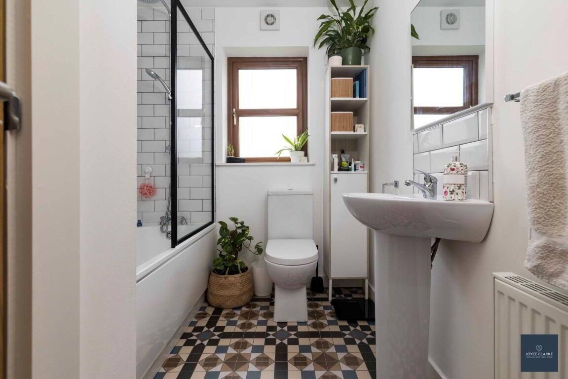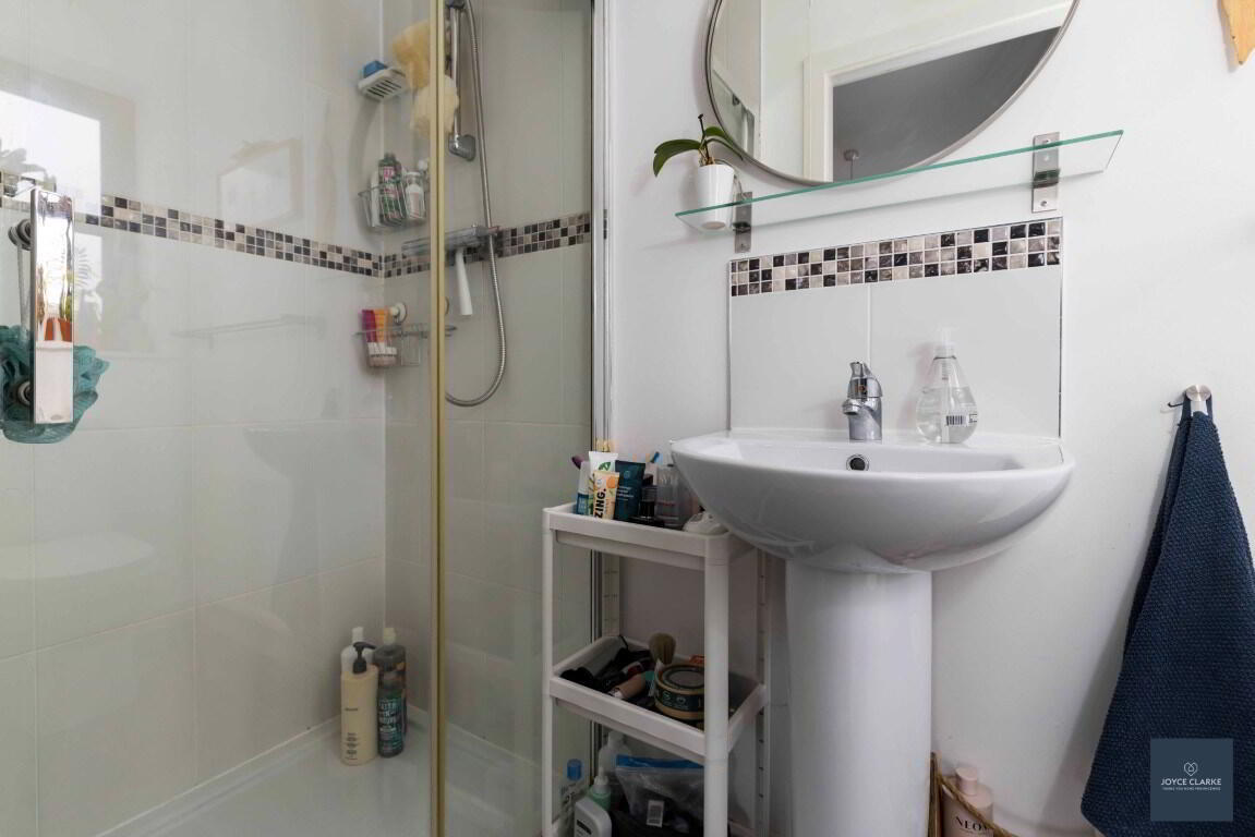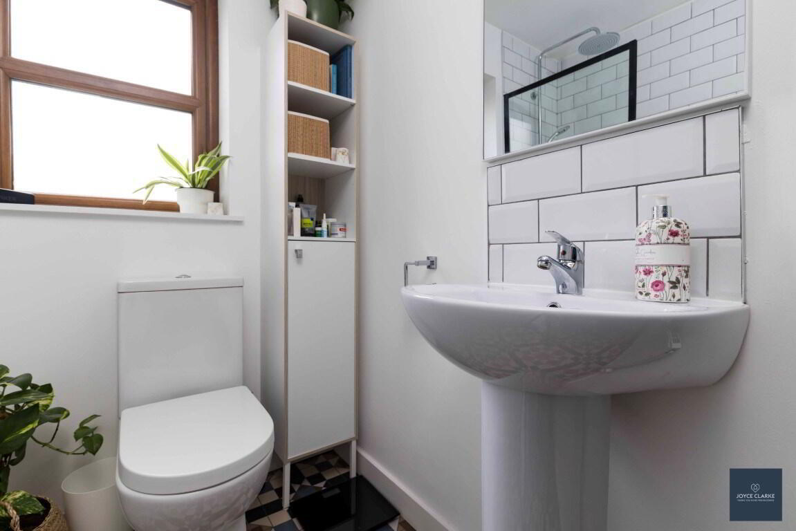 Shower enclosure with mains fed shower. WC. Pedestal style sink with mixer tap. Double panel radiator. Tiled floor, part tiled walls. Window. Extractor.