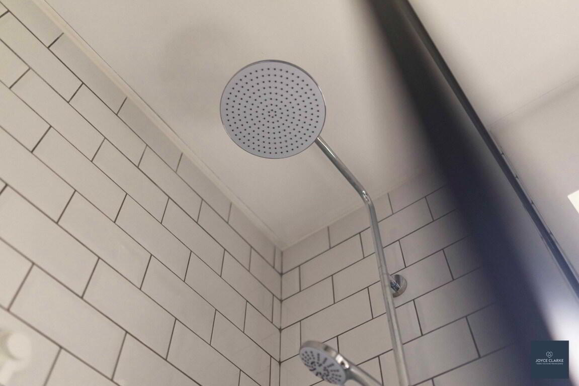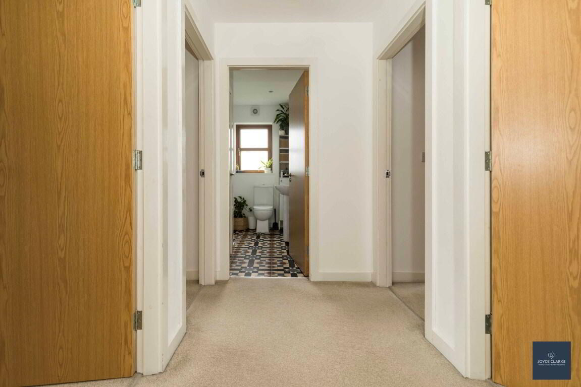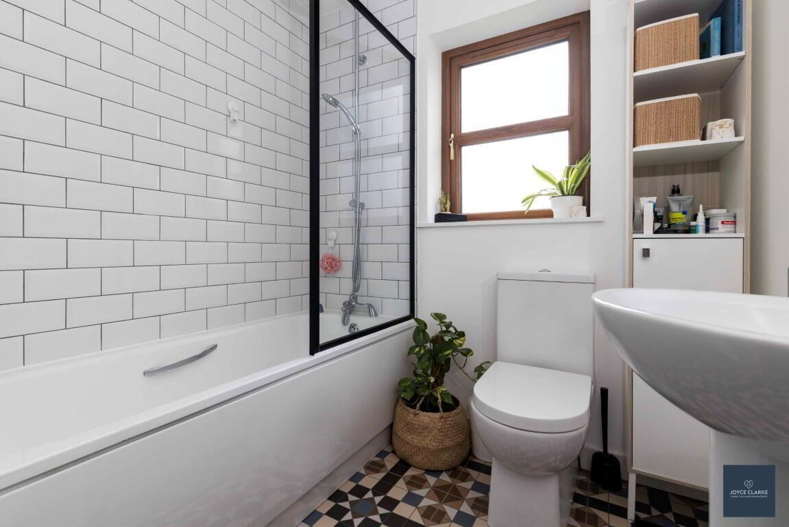 Modern three piece suite comprising of bath with waterfall dual shower over. Back to wall dual flush WC. Pedestal style sink with mixer tap. Double panel radiator. Tiled floor and part tiled walls. Recessed lighting. Window. Extractor. Hotpress.