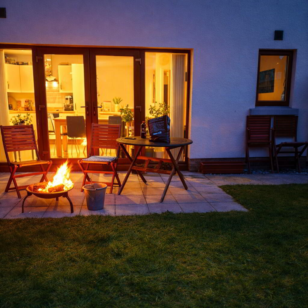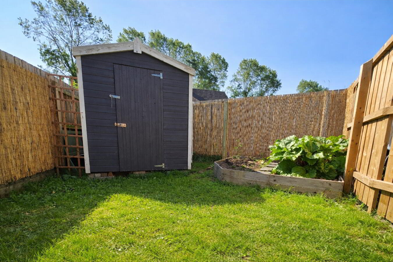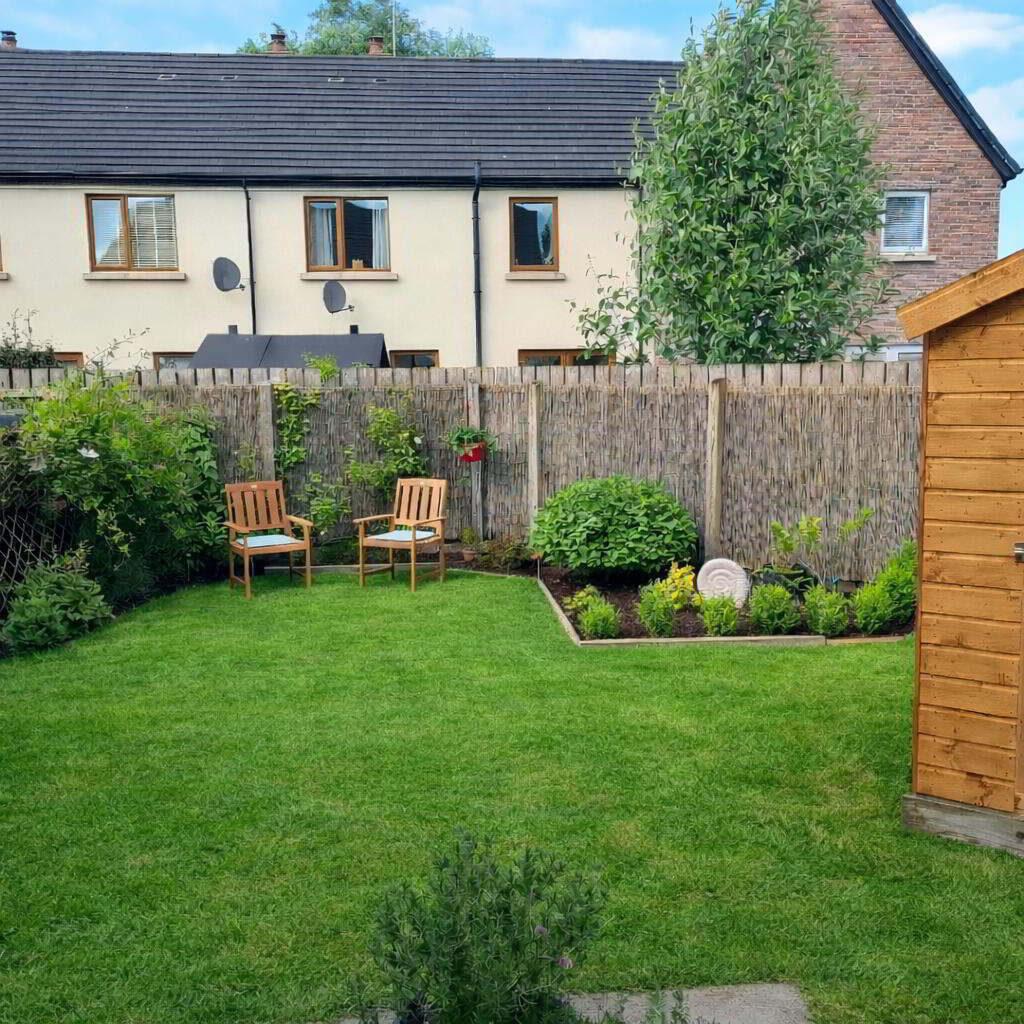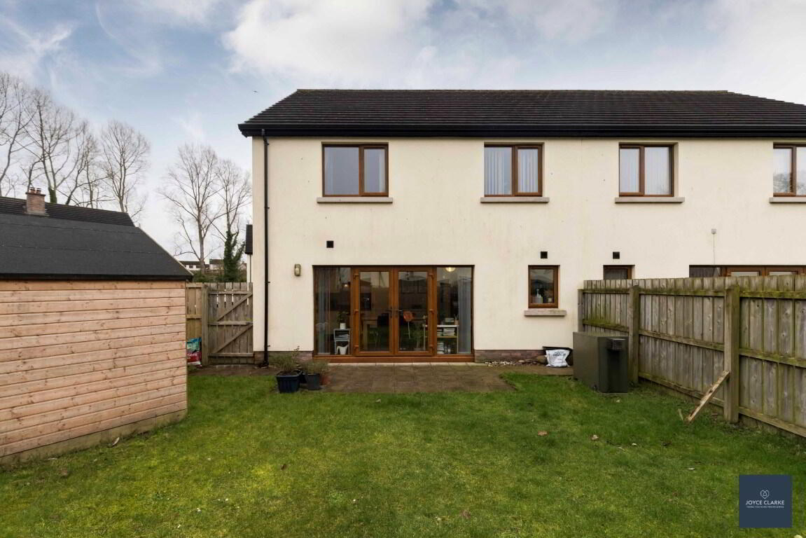 Fully enclosed rear garden, laid in lawn with mature shrubs. Paved patio area. Garden sheds. Outside tap. Wired for electric car charger. Tarmac driveway.