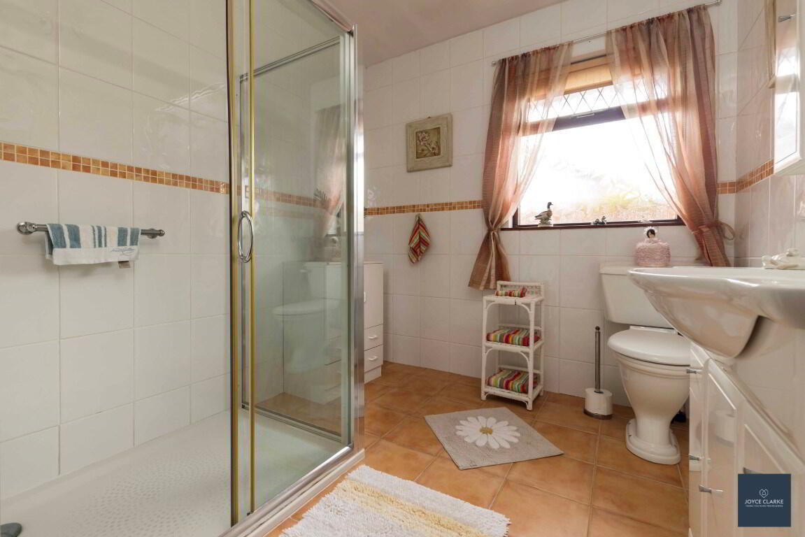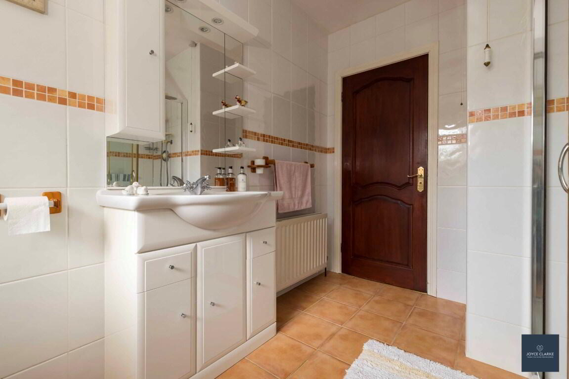 Fully tiled family bathroom comprising of large shower enclosure with mains fed shower, close coupled WC and wash hand basin with vanity unit below. Double panel radiator. Extractor fan.