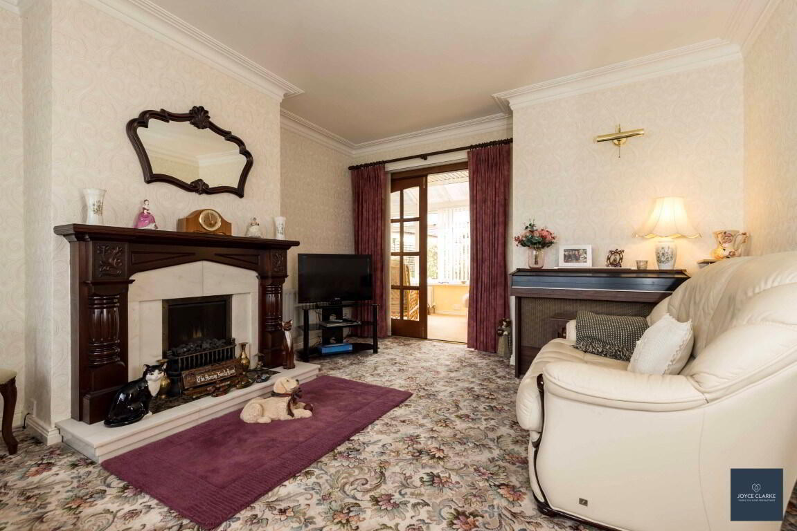 Front aspect reception room with feature fireplace with mahogany surround, marble back panel and hearth, electric insert. TV point. Two double panel radiators. Double French doors with glazed panels leading to conservatory.