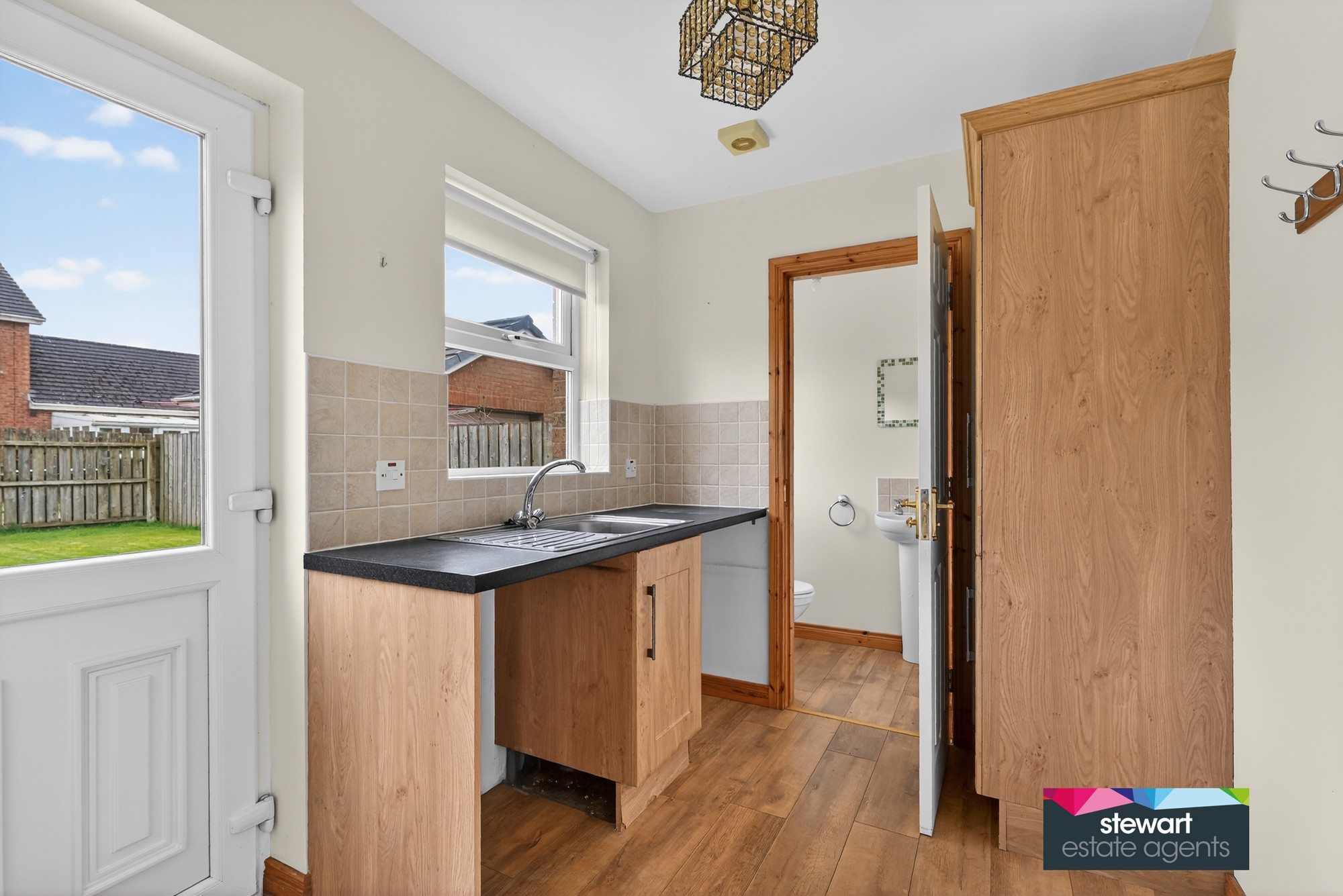 Downstairs cloak room with WC and wash hand basin. PVC double glazed rear door