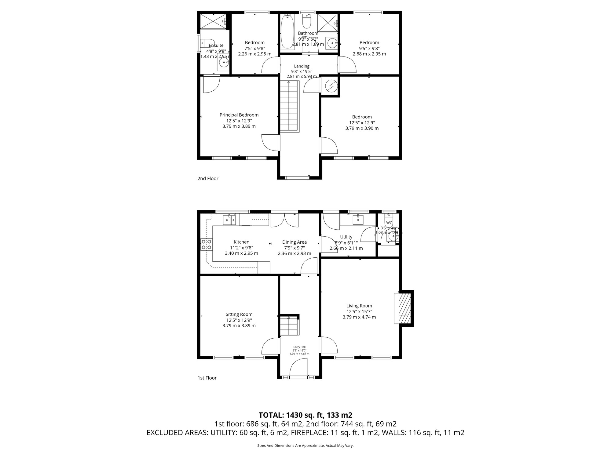 Bathroom on the first floor with a modern suite including a bath, WC and wash hand basin as well as a separate shower cubicle. Fully tiled walls