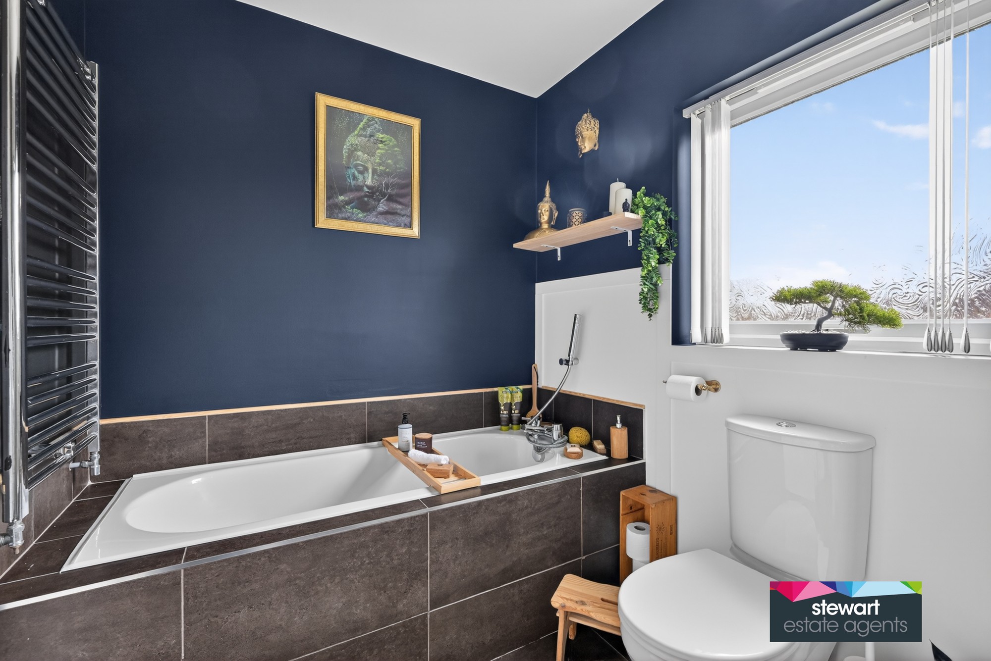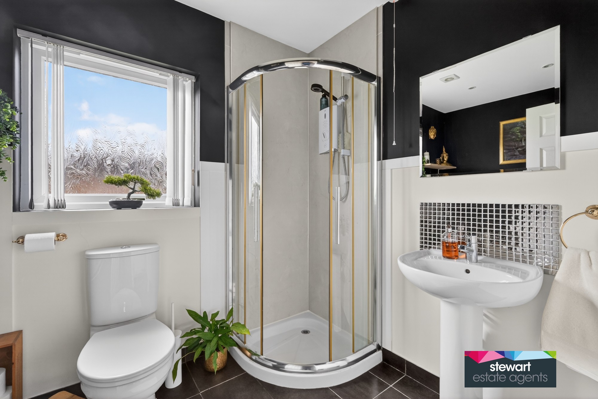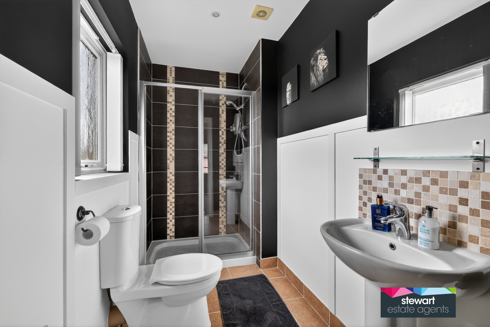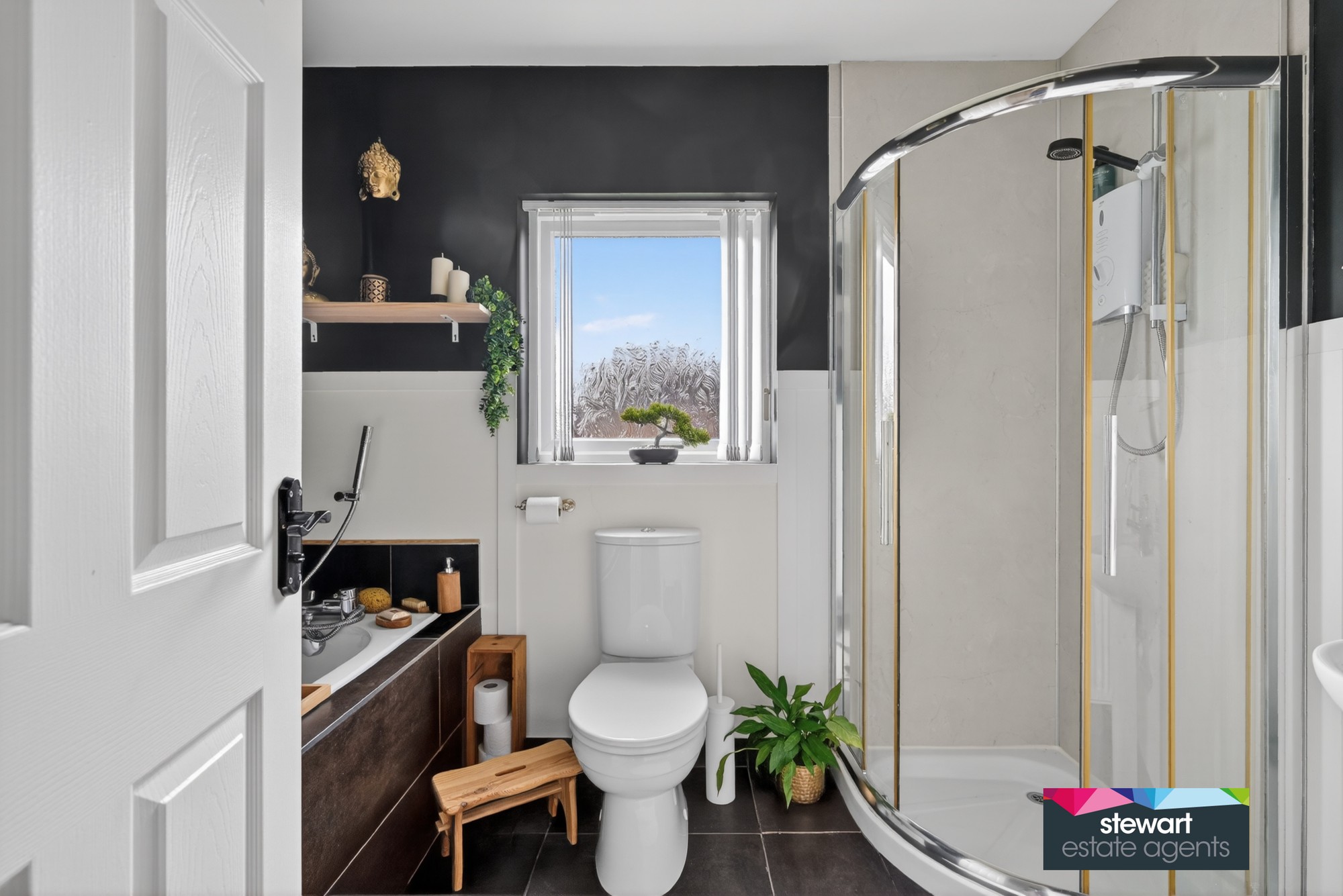 Bathroom with a stylish suite including a tiled panelled bath, WC and wash hand basin. Separate shower cubicle with shower fitment. Towel rail. Tiled floor