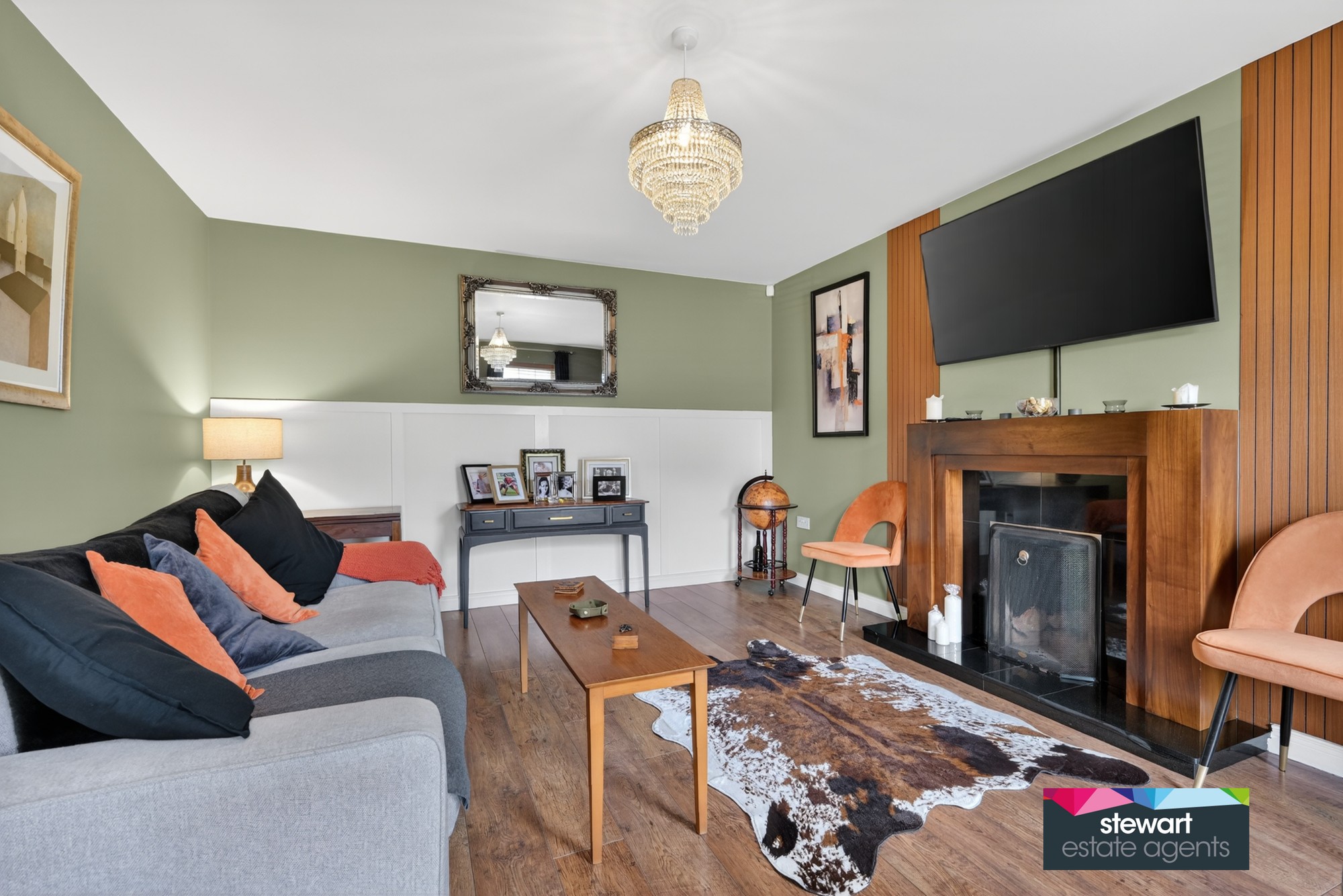 Living room with a contemporary style fireplace and an open fire. Feature panelled wall