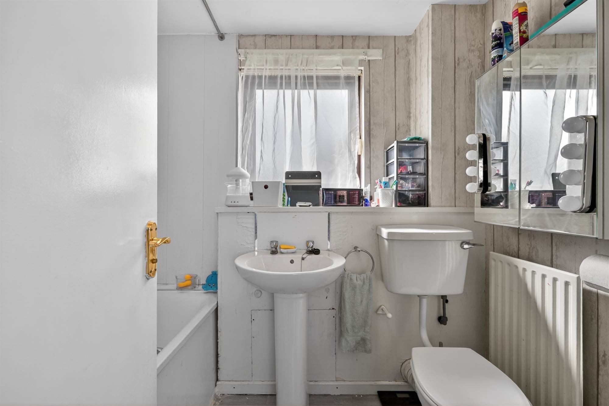 Low flush wc, wash hand basin, bath with overhead shower, boiler cupboard, vinyl flooring, mirrored vanity unit.