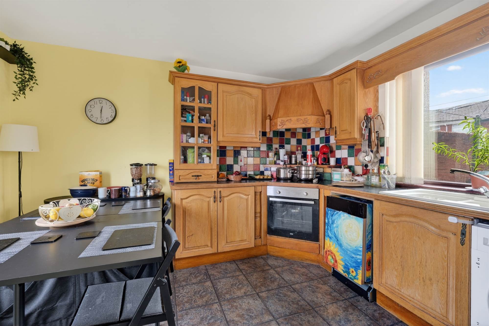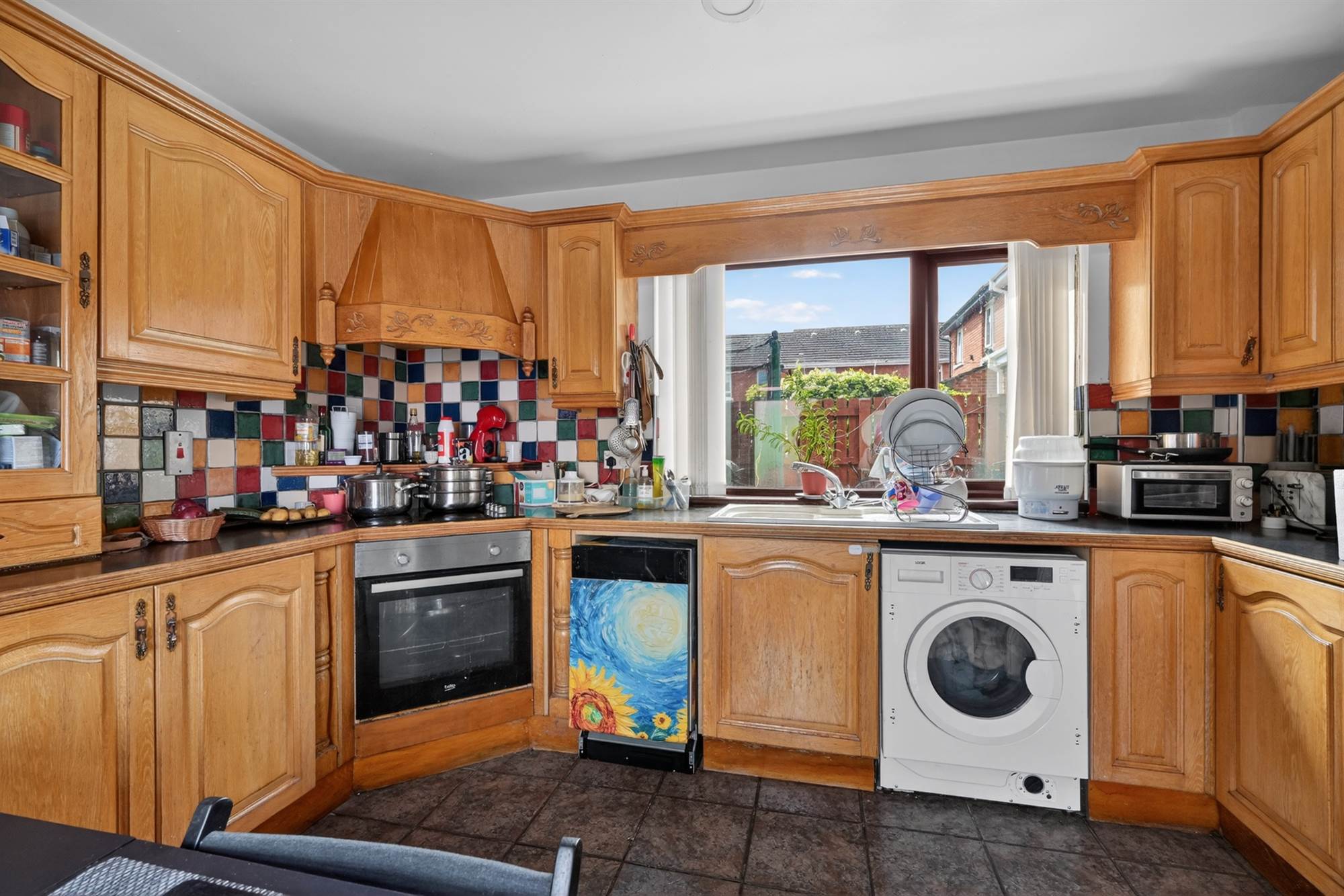 Range of high and low level units, built-in ovens and extractor fan, sink with mixer tap, plumbed for dishwasher and washing machine, laminate work surfaces, ceramic tiled floor.