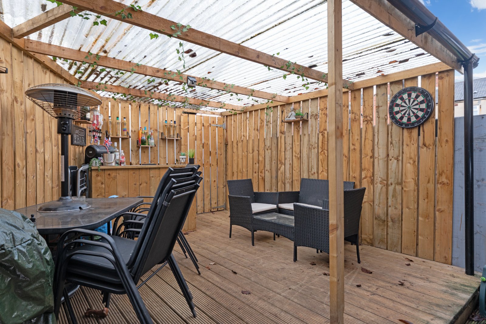 Gates to paved off street parking and seated area enclosed by brick wall and railing. Enclosed rear decked sitting area