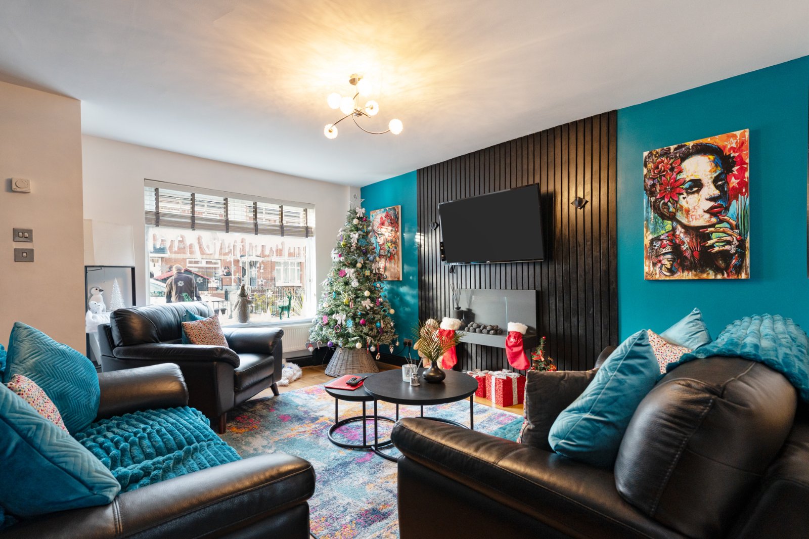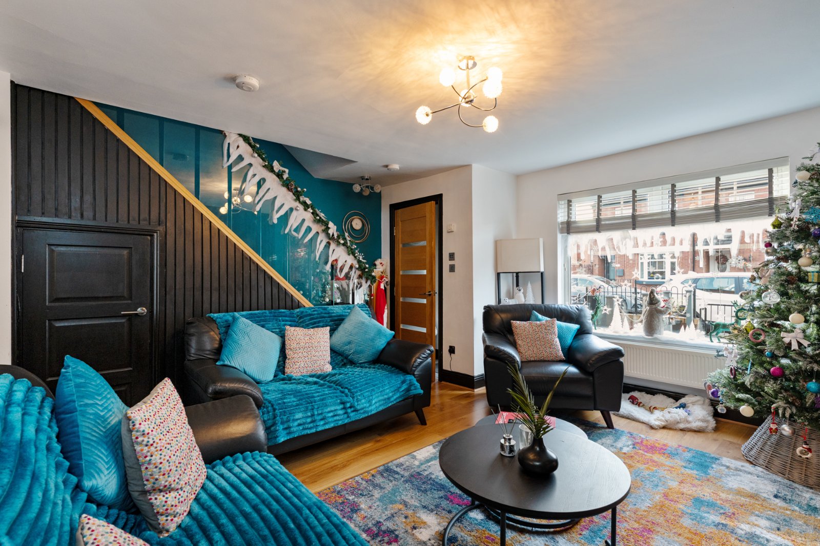 Feature wood wall, feature wall mounted fire, understairs storage cupboard