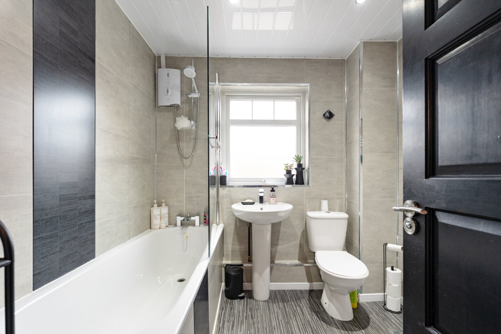 Low flush WC, pedestal wash hand basin, bath with electric shower above, glass shower cubicle, chrome heated towel radiator, spotlighting, PVC panelled walls and ceiling
