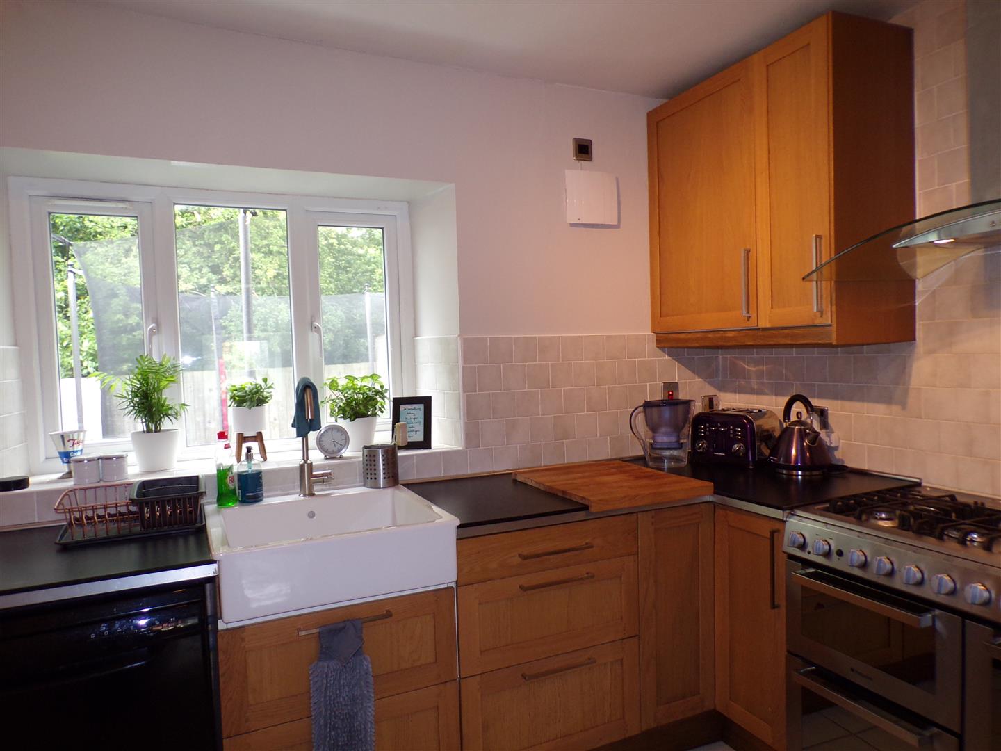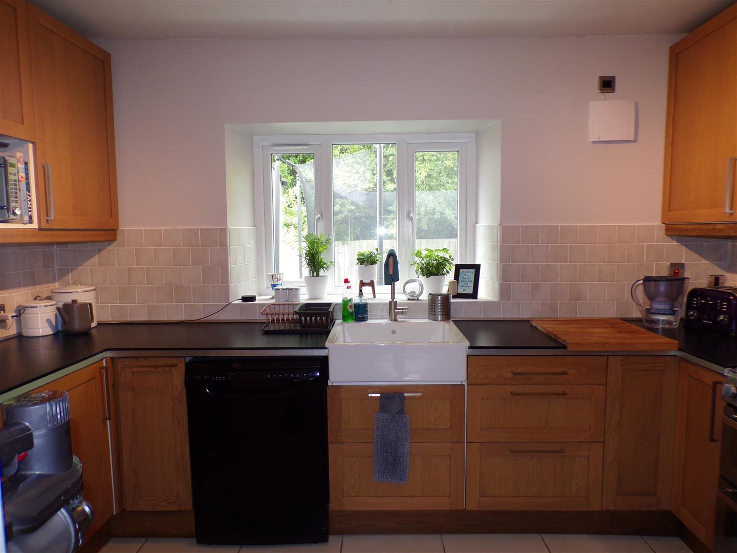 Having range of eye and low level units, 'Belfast' sink, 'Hot Point' cooking centre comprising gas hob, two electric ovens, grill and warming drawer, extractor hood, plumbed for dishwasher, space for fridge freezer, tiling between units, tiled floor.