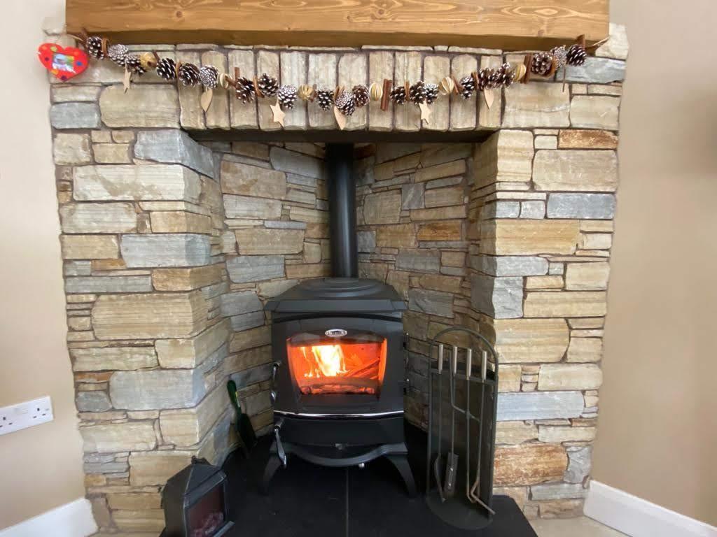 Having range of eye and low level units, 1 1/2 bowl stainless steel sink unit with mixer taps, hob, underoven, extractor hood, integrated fridge/freezer and dishwasher, multi fuel stove set in brick fireplace, dining space, recessed lighting, tiled floor.