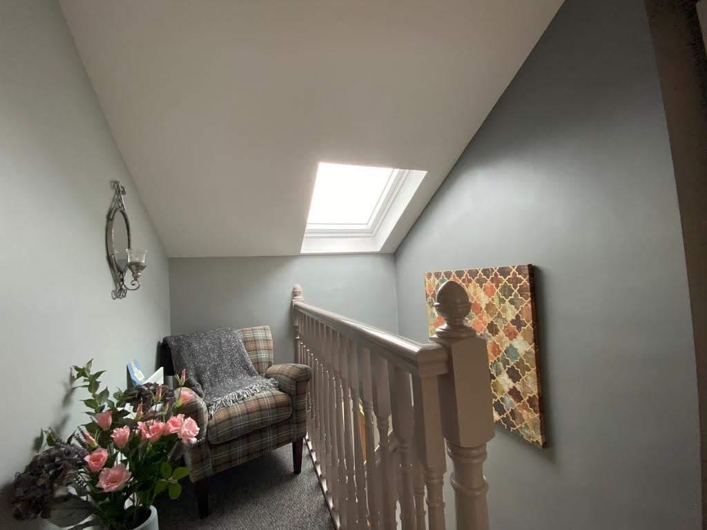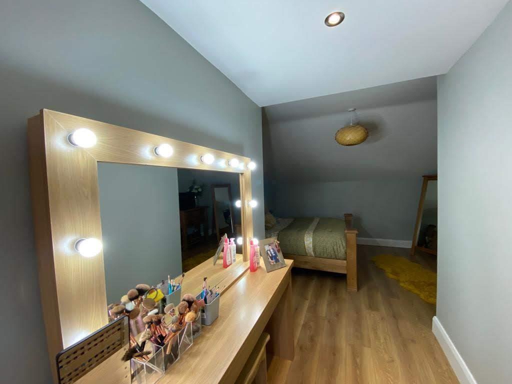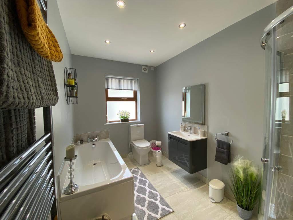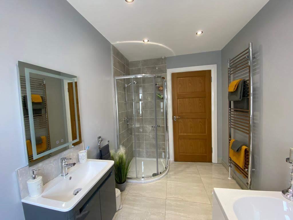 Comprising bath, fully tiled walk in shower, whb set in vanity unit, wc, chrome radiator, recessed lighting, tiled floor.