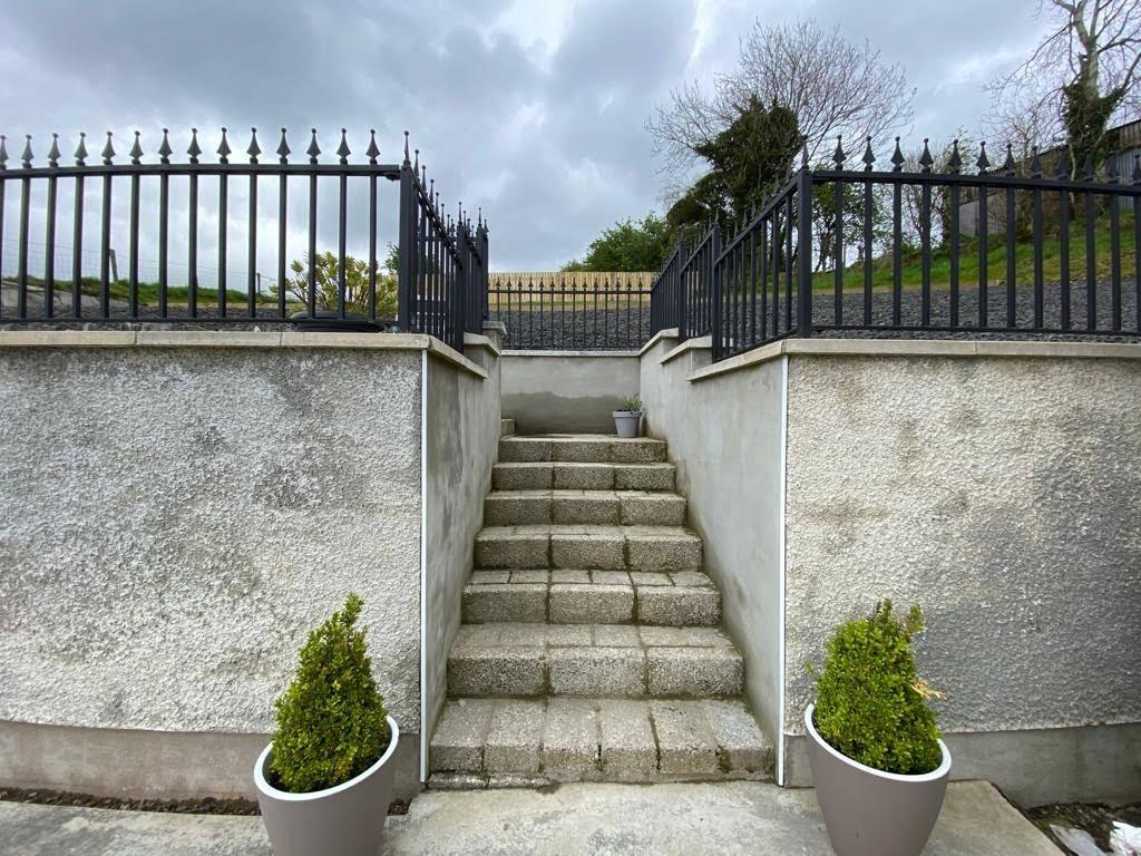 Walled to rear with steps leading to patio area and raised lawn.