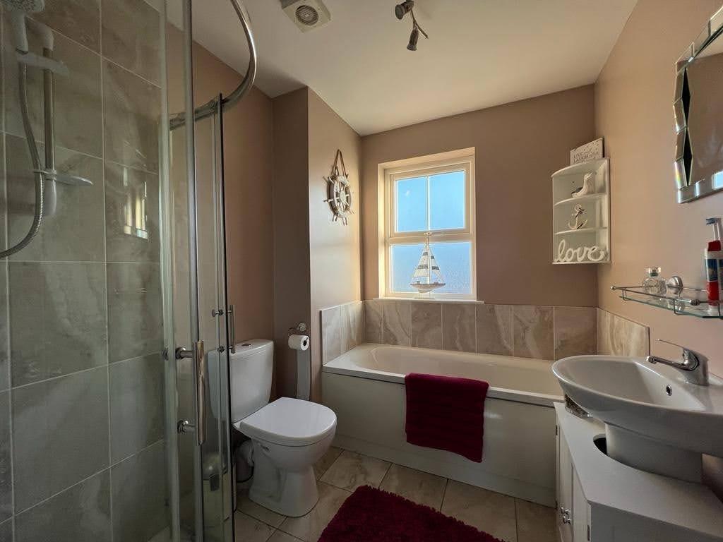 Comprising bath, fully tiled walk in electric shower, whb and wc, tiled floor.
