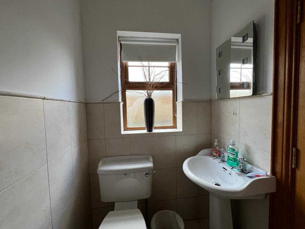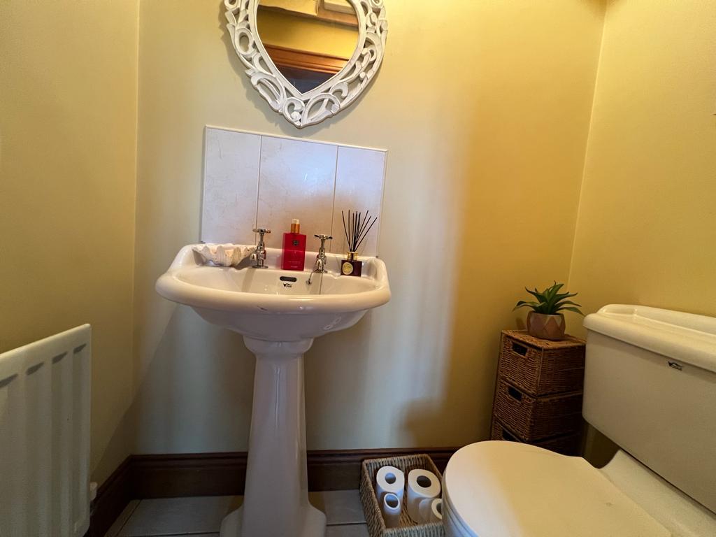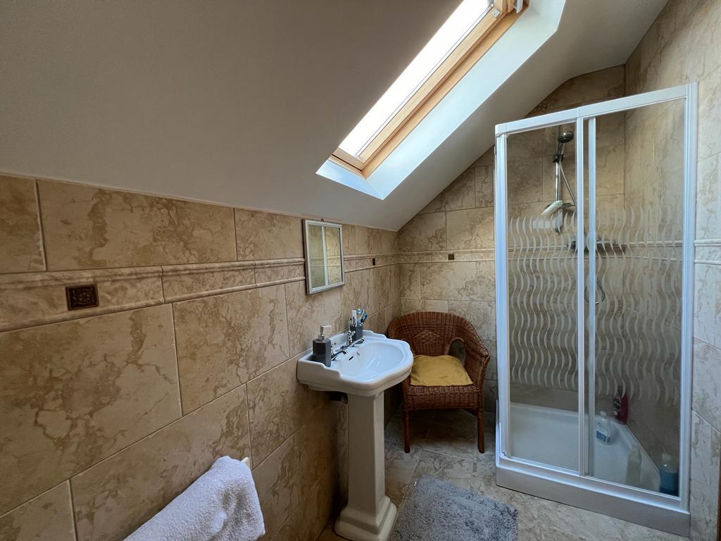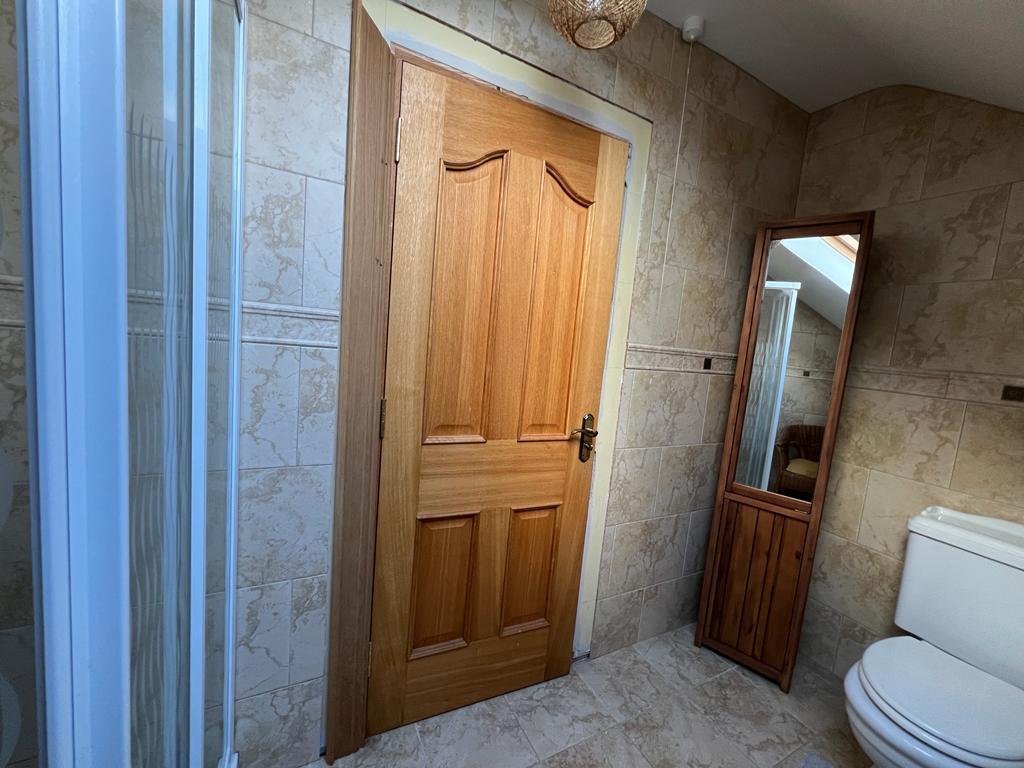 Comprising fully tiled walk in shower, whb and wc, ceiling cornicing, 1/2 tiled walls, tiled floor.