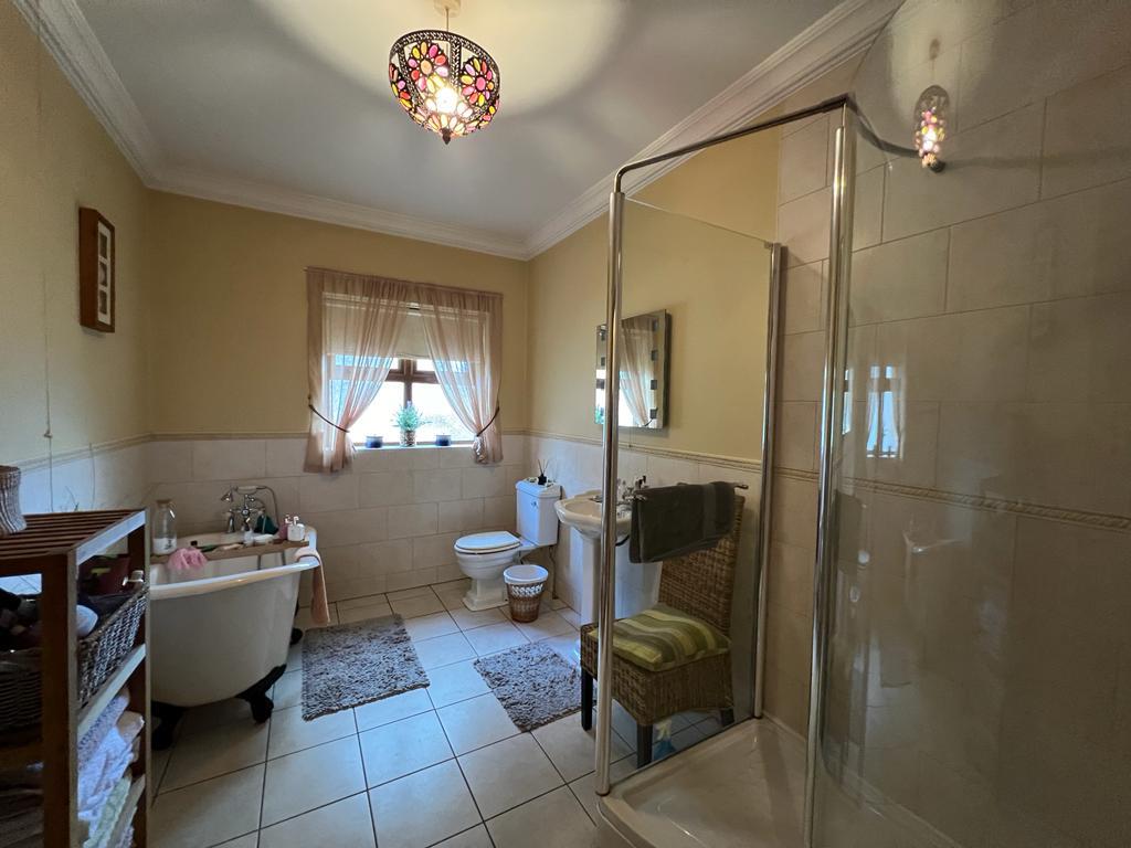 Comprising free standing bath, whb and wc, walk in tiled electric shower, ceiling cornicing, 1/2 tiled walls, tiled floor.