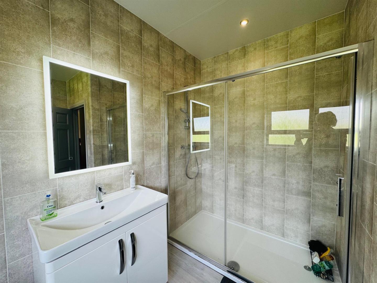 Comprising walk in shower, whb and wc, wall mounted mirror with LED light, PVC cladding to walls.