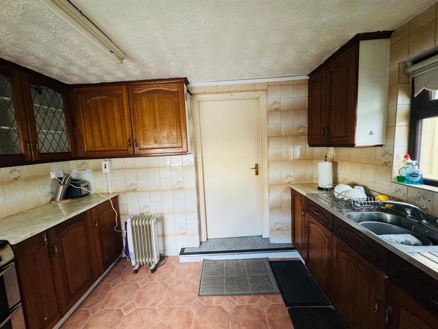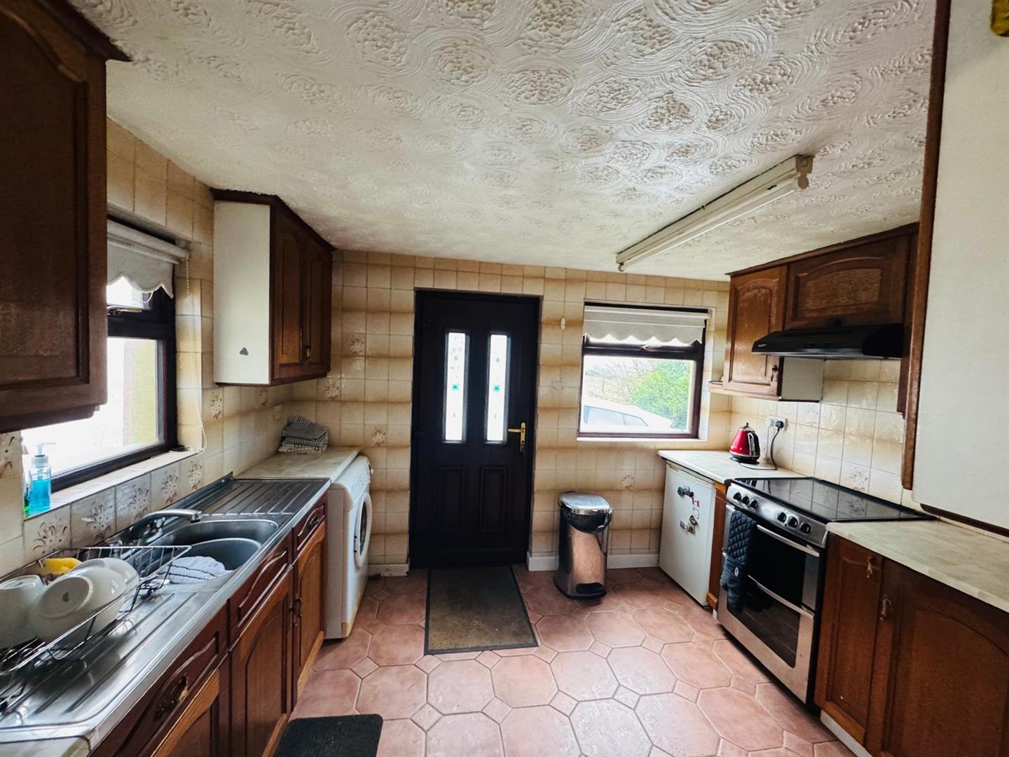 Having eye and low level units, double drainer stainless steel sink unit with mixer taps, plumbed for washing machine, wired for cooker, tiled walls and floor.