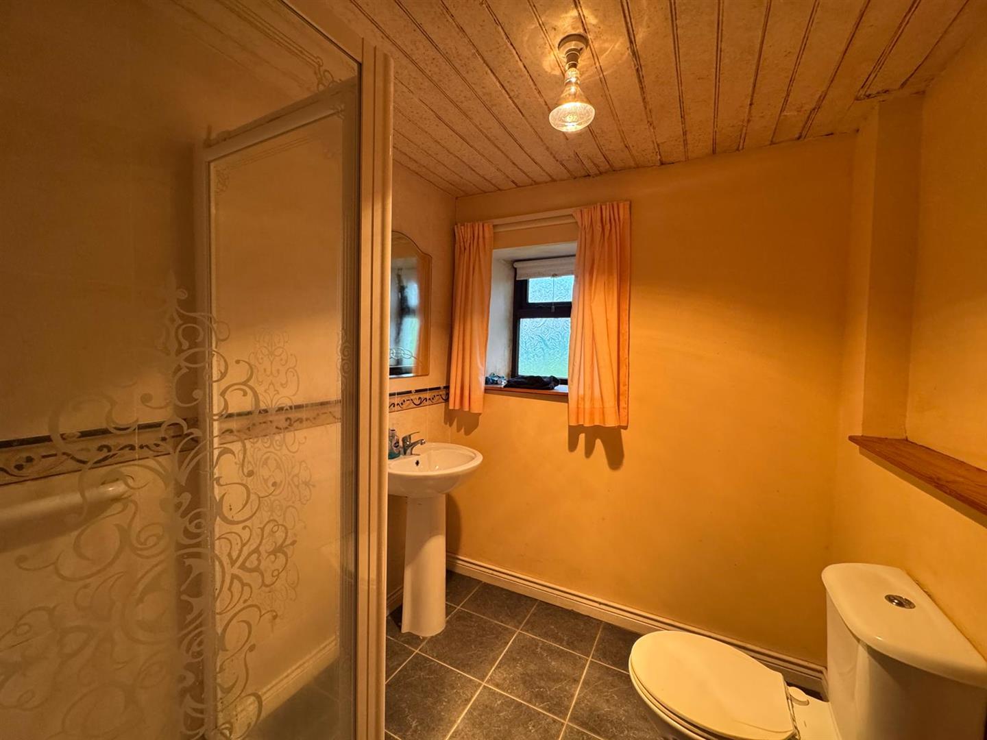 Comprising walk in tiled shower, whb and wc, tiled floor.