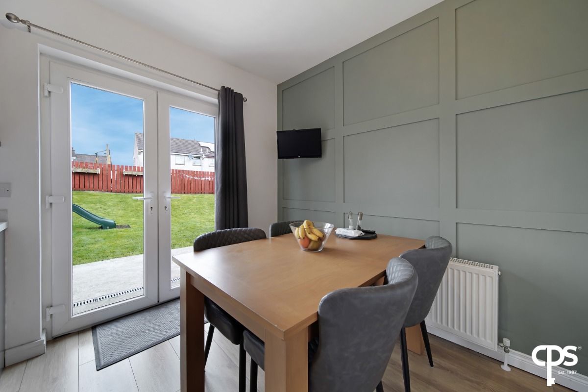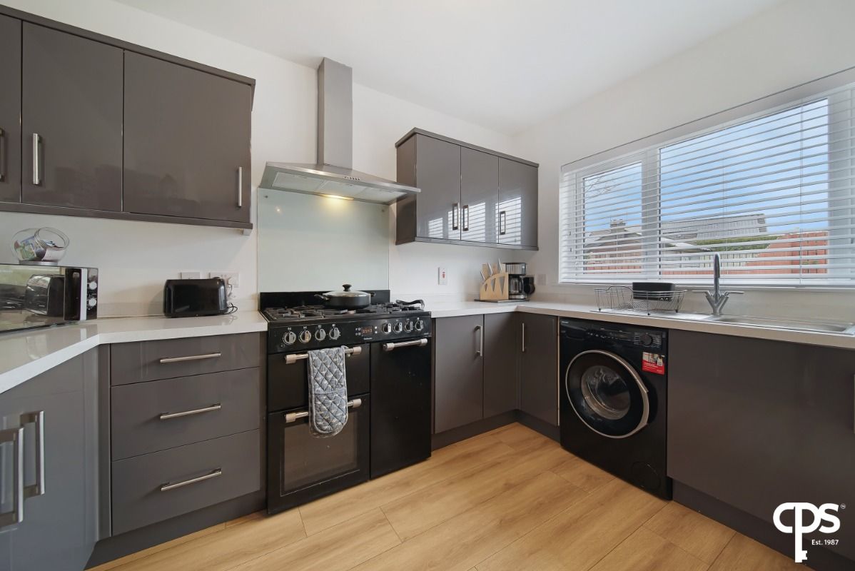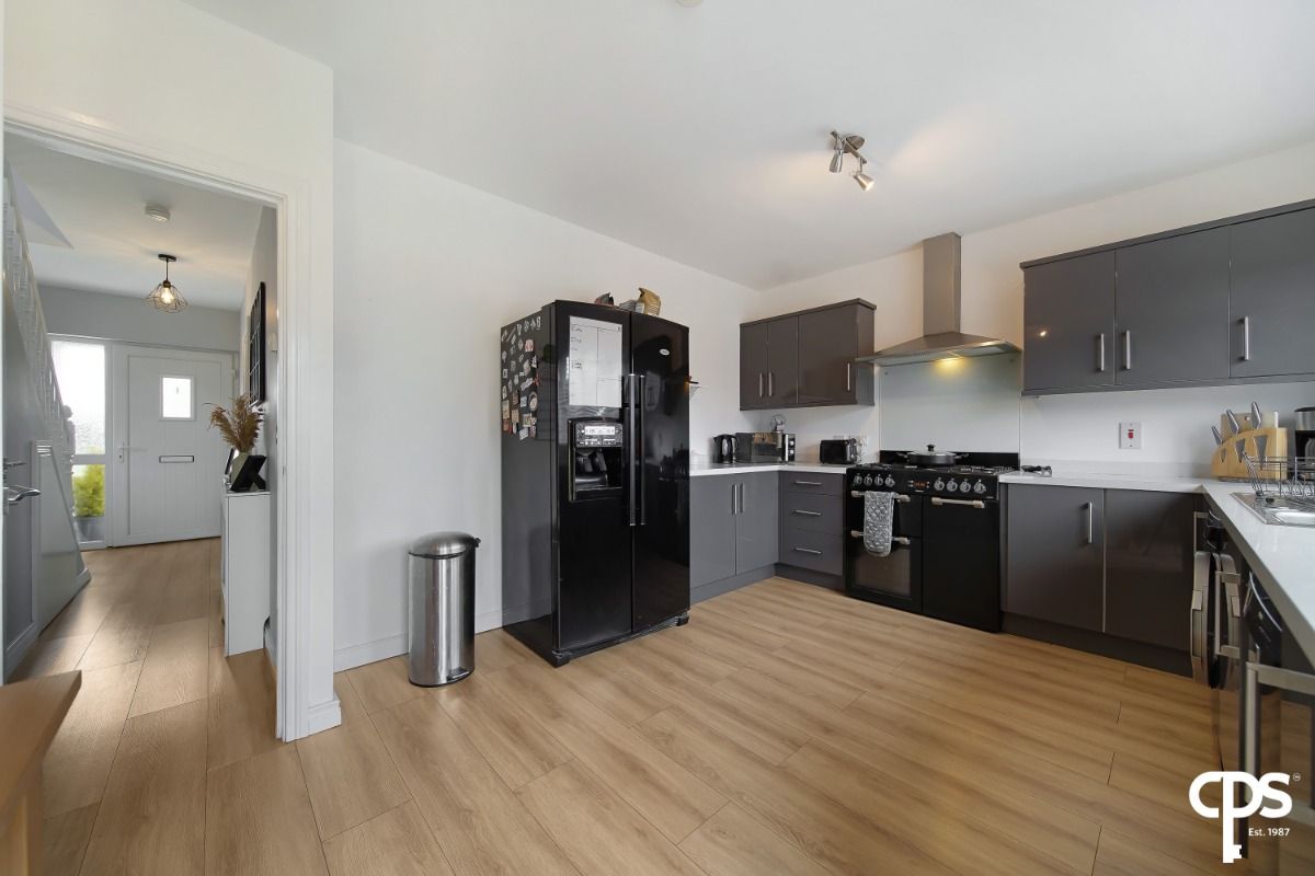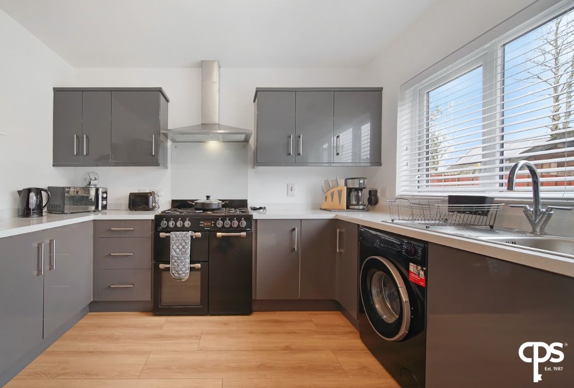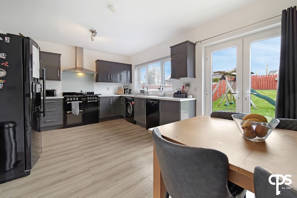Kitchen/Dining 5.7m x 3.4m - matching laminate floor covering, attractive range of high gloss eye and low level units, 5 ring Cookmaster range style hob and oven combined, stainless steel extractor hood over, plumbed for automatic washing machine, plumbed for dishwasher, stainless steel sink unit with mixer taps, feature panelling to one wall, patio doors to rear garden