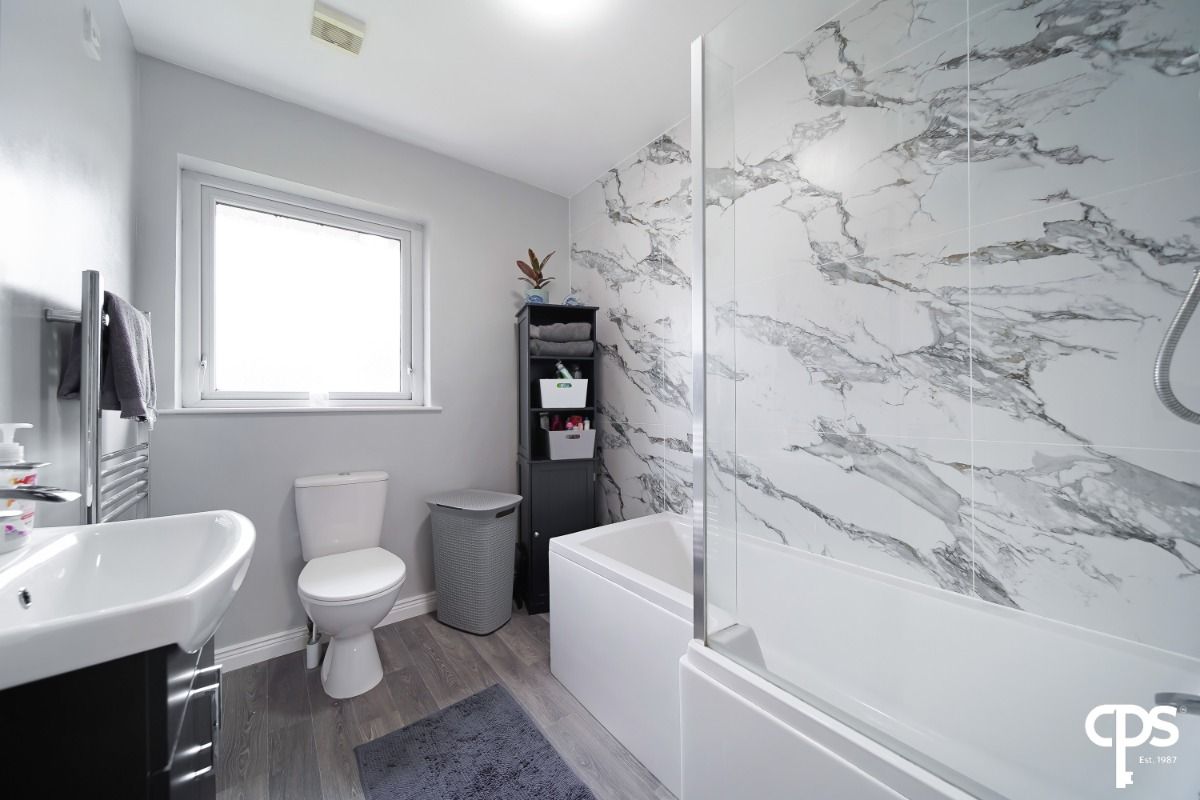 Family Bathroom 2m x 2.5m - wc and wash hand basin vanity mirror over, vanity cupboard under, bath with electric power shower over, heated towel rail, laminate floor covering