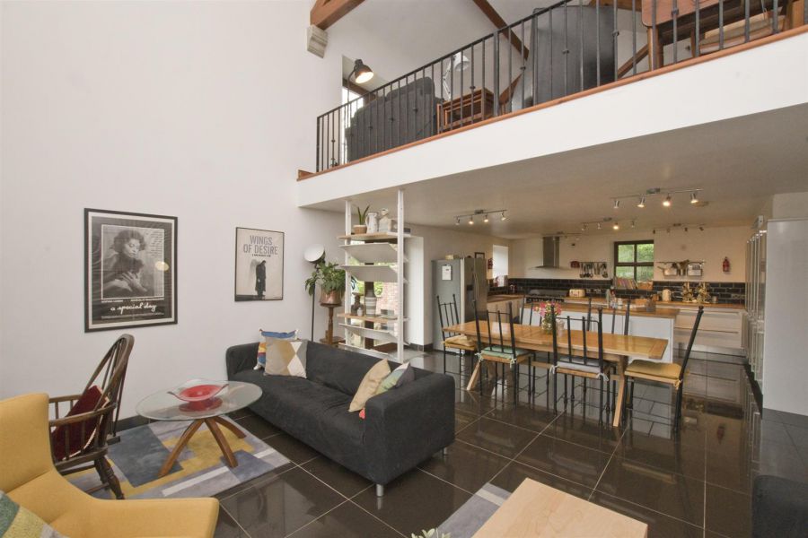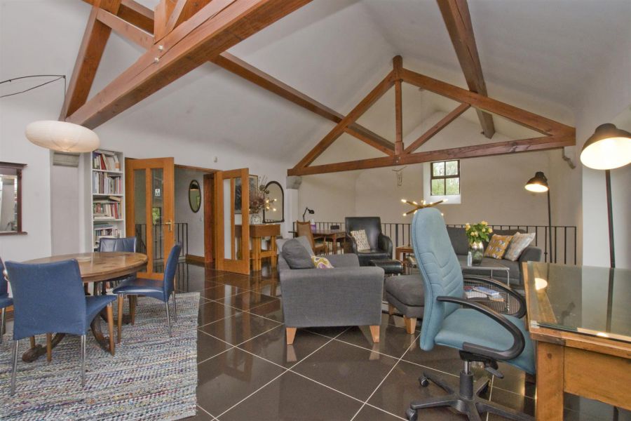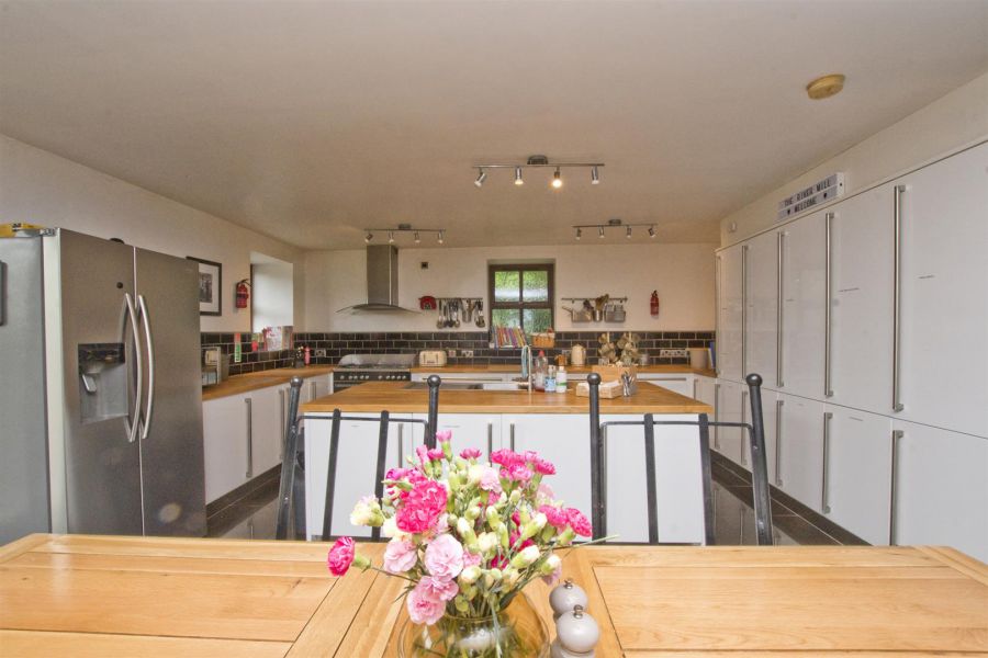 Open plan living, kitchen and dining area with vaulted ceiling with exposed beams and trusses. High gloss porcelain tiled floor. Kitchen with extensive contemporary high and low level units with woodblock work tops. Large Island unit with double stainless steel sink unit. Large larder units. Recess for dishwasher Door to garden.