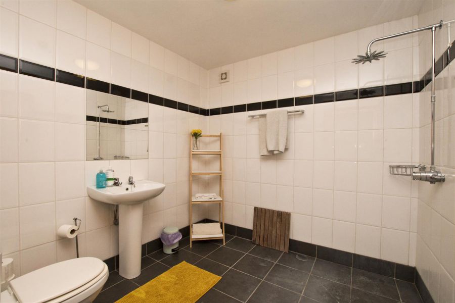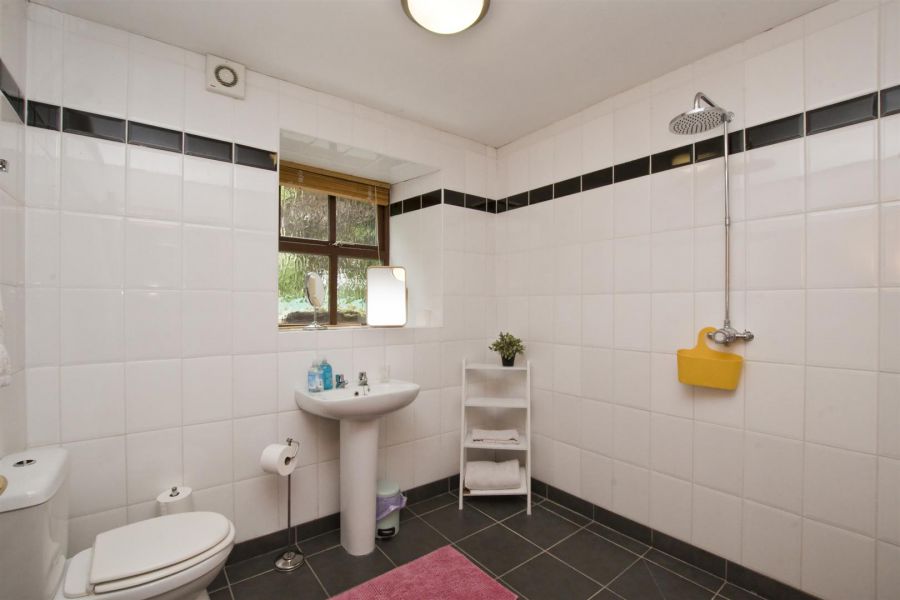 Fully tiled. Shower area with chrome fixed head shower, pedestal wash hand basin and low flush w.c., Extractor fan.
