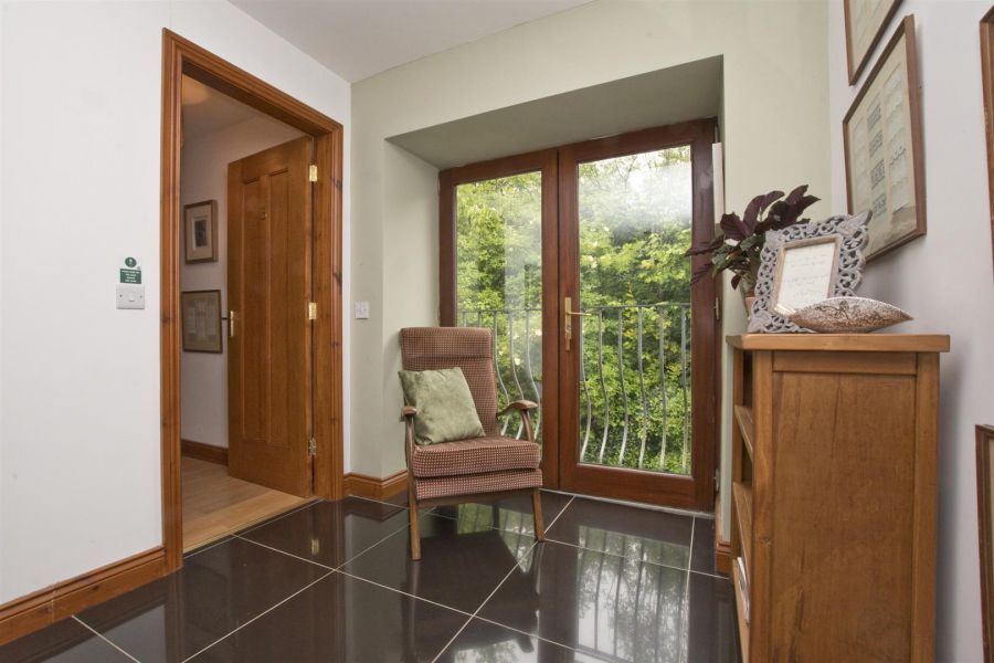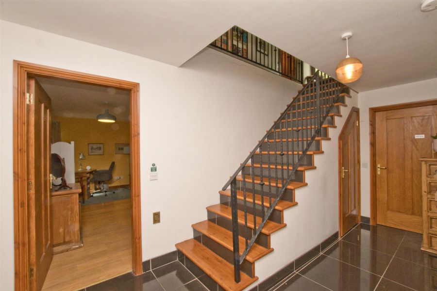 High gloss porcelain tiled floor. Staircase with pine treads and wrought iron railings. Understairs cloakroom with low flush w.c and wash hand basin. Tiled floor. Extractor fan.