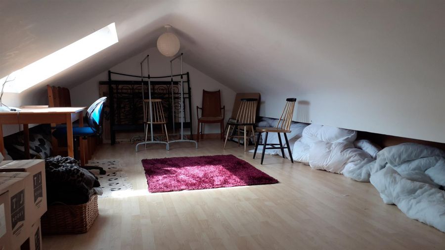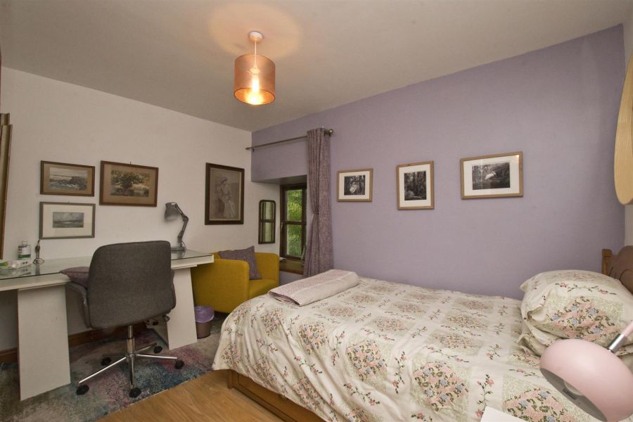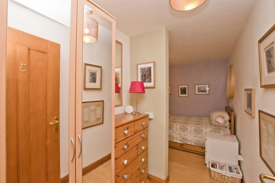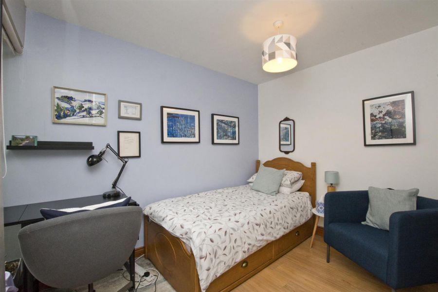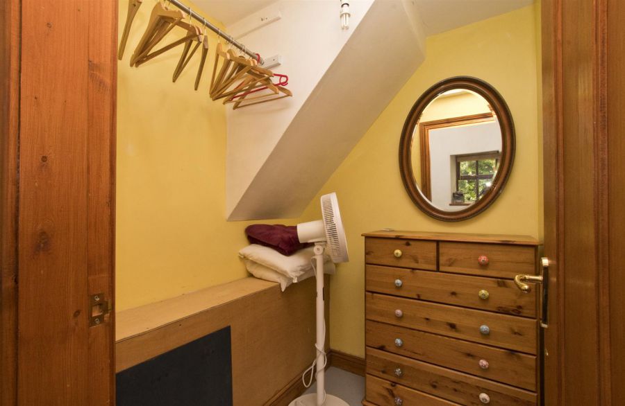 High gloss porcelain tiled floor. Walk in wardrobe. Built in cupboard with pressurised water tank and steps to floored roofspace ideal for storage or leisure or recreational activities. Exposed beams. Velux window.