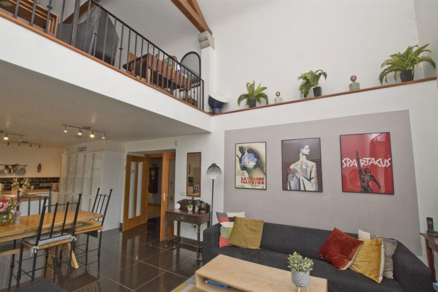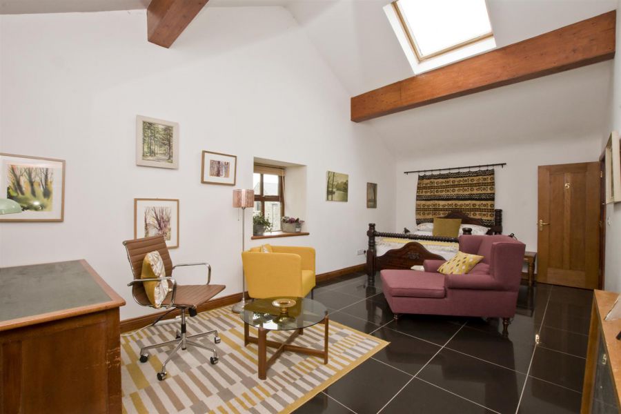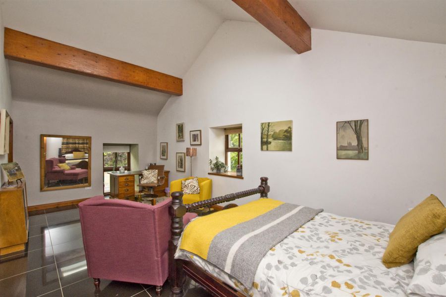 Exposed trusses and beams, spotlights. High gloss porcelain tiled floor. Double doors to landing. Juliette balcony.
