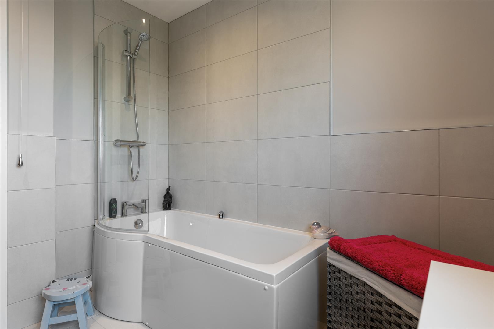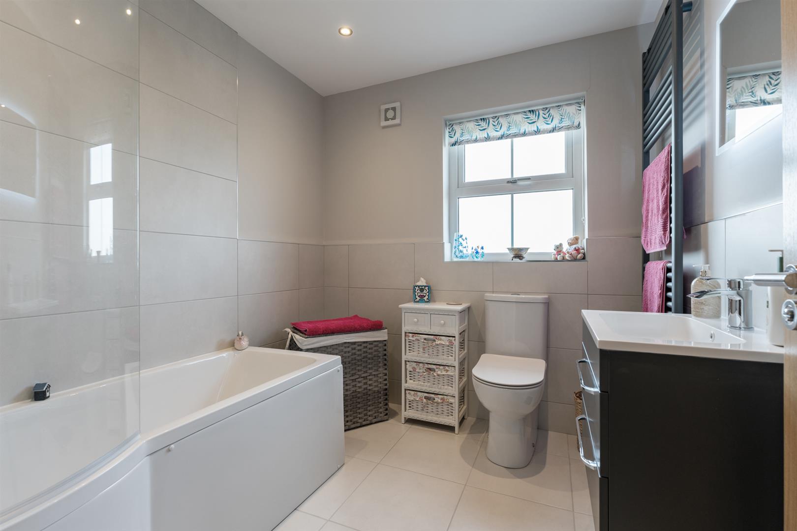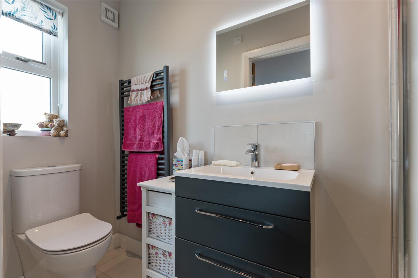 White P shaped bath with wall shower over, low flush w.c, vanity unit. Illuminated mirror. Towel radiator. Part tiled walls. Tiled flooring.