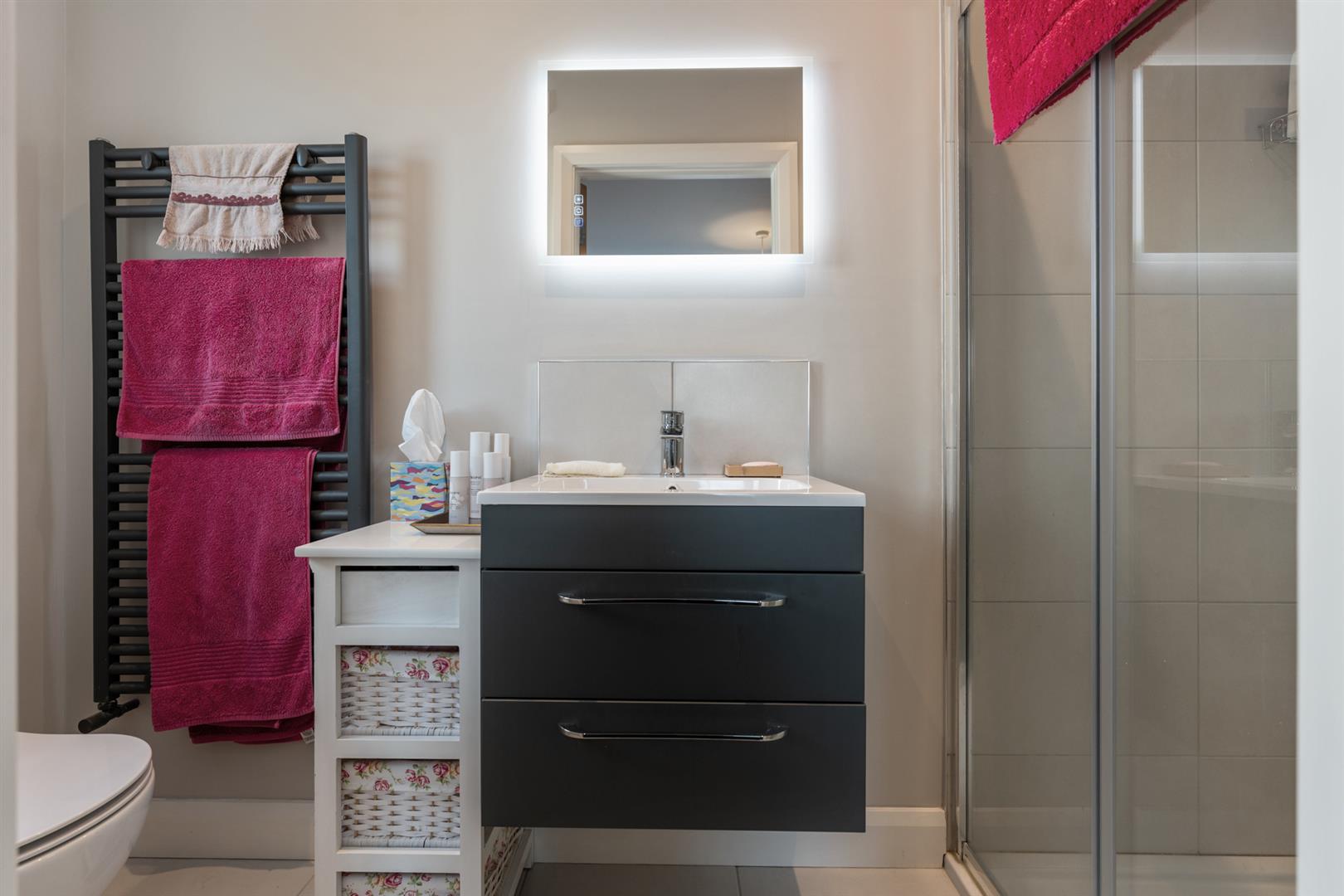 Shower cubicle with wall shower, vanity unit, low flush w.c. Tiled floor. Illuminated mirror.