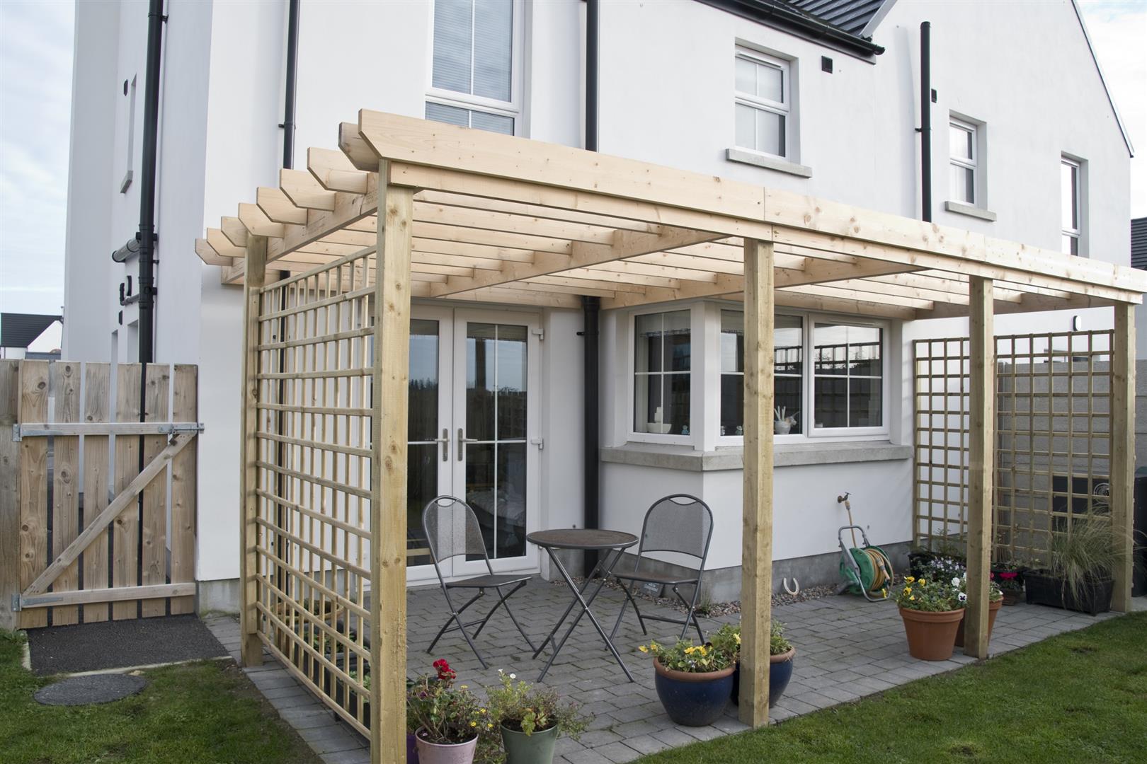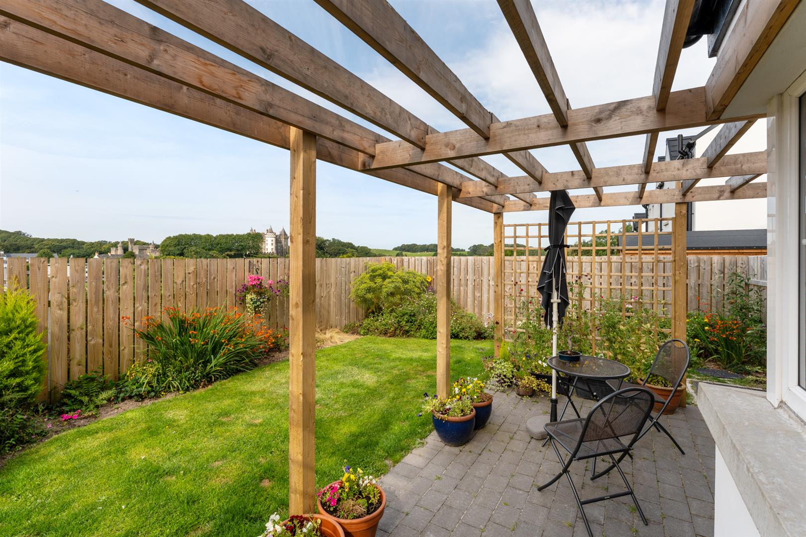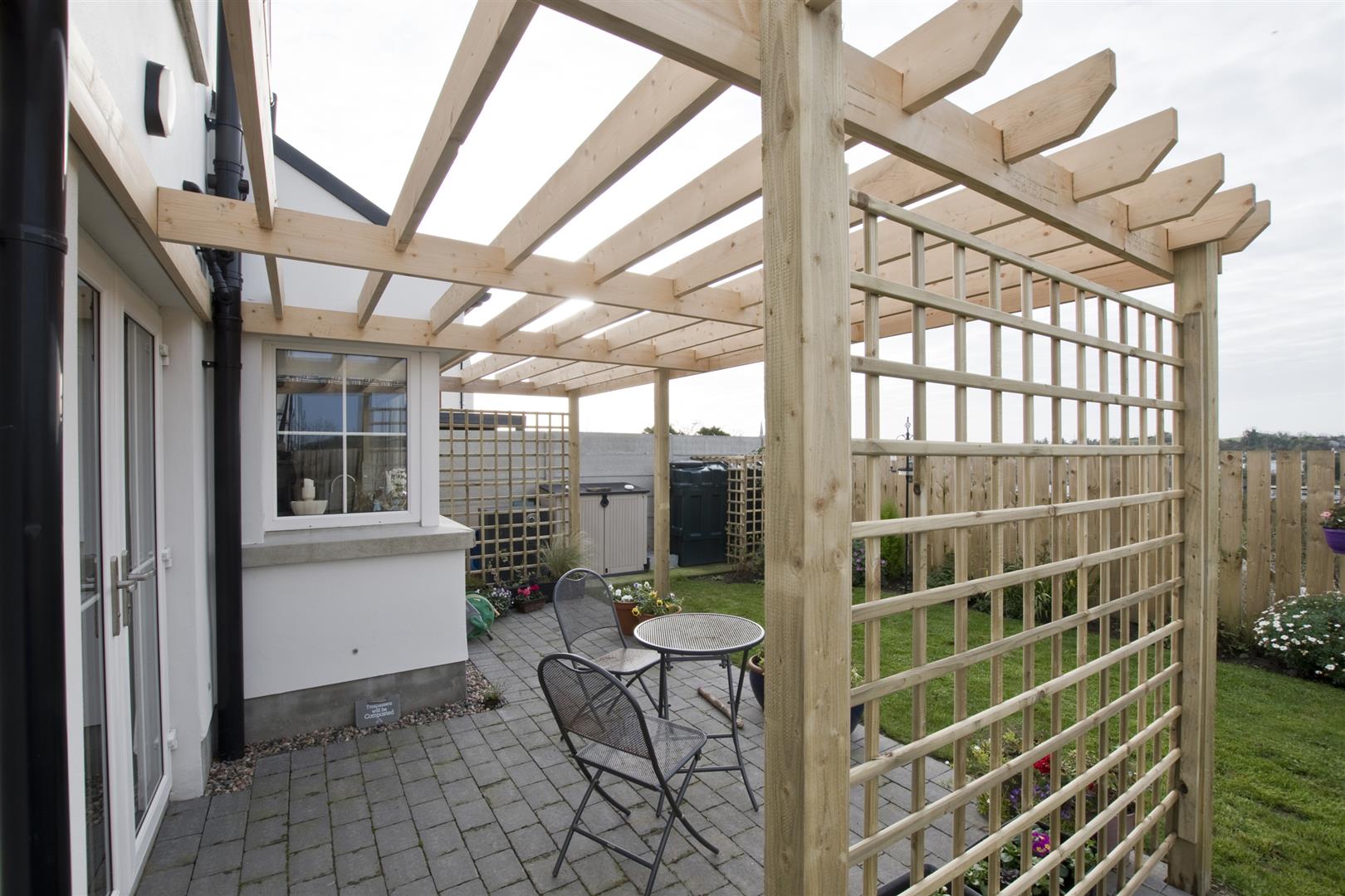Tarmac driveway to the side with gardens in lawn to the front and enclosed rear garden in lawn with flower beds with outside lighting. Feature pergola with views towards the Sea and Killyleagh Castle.