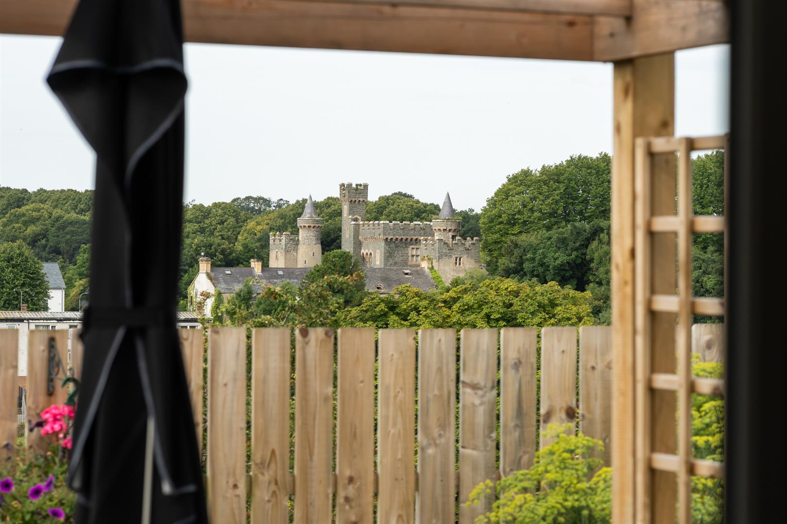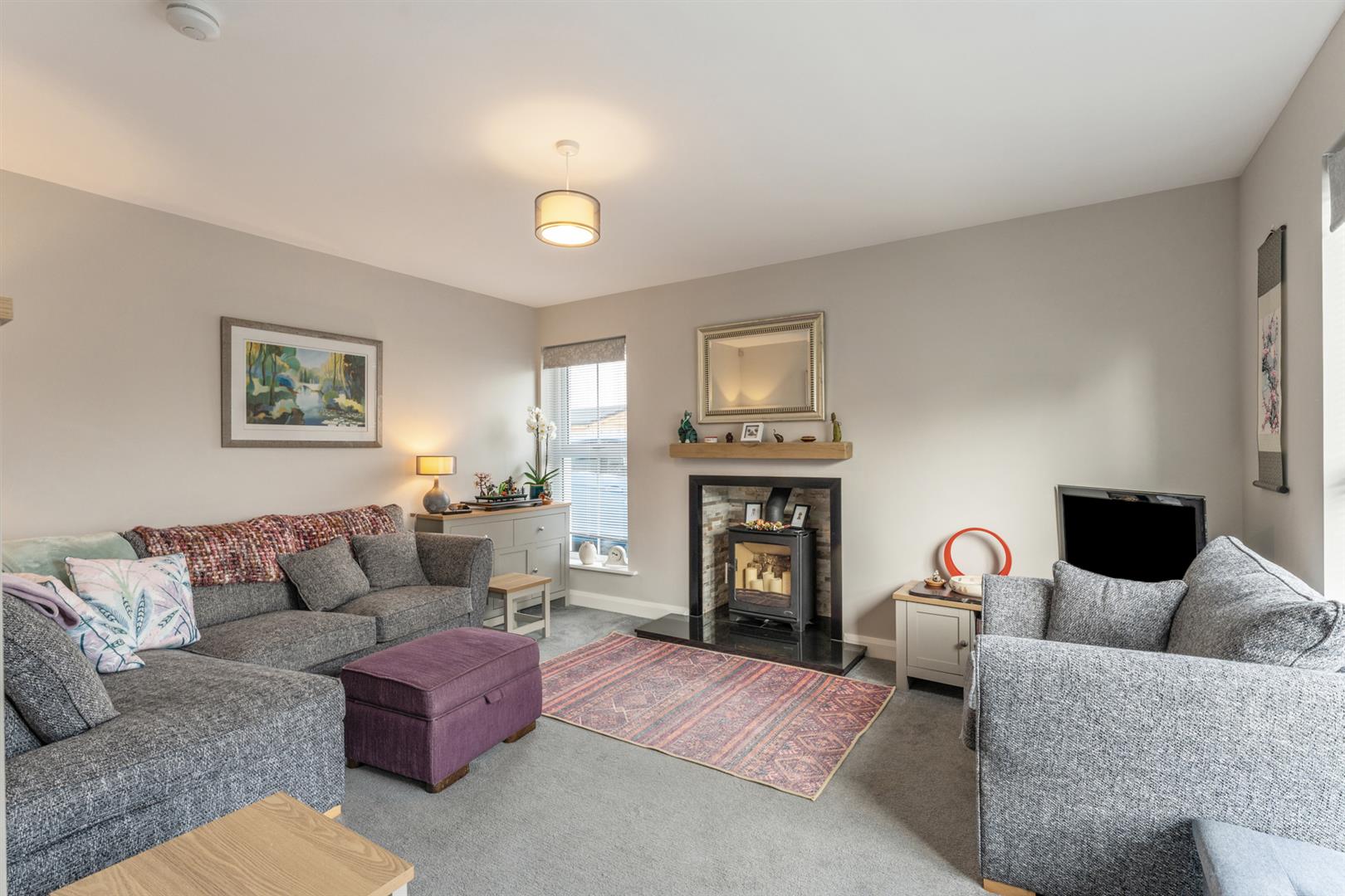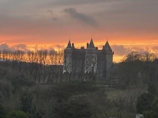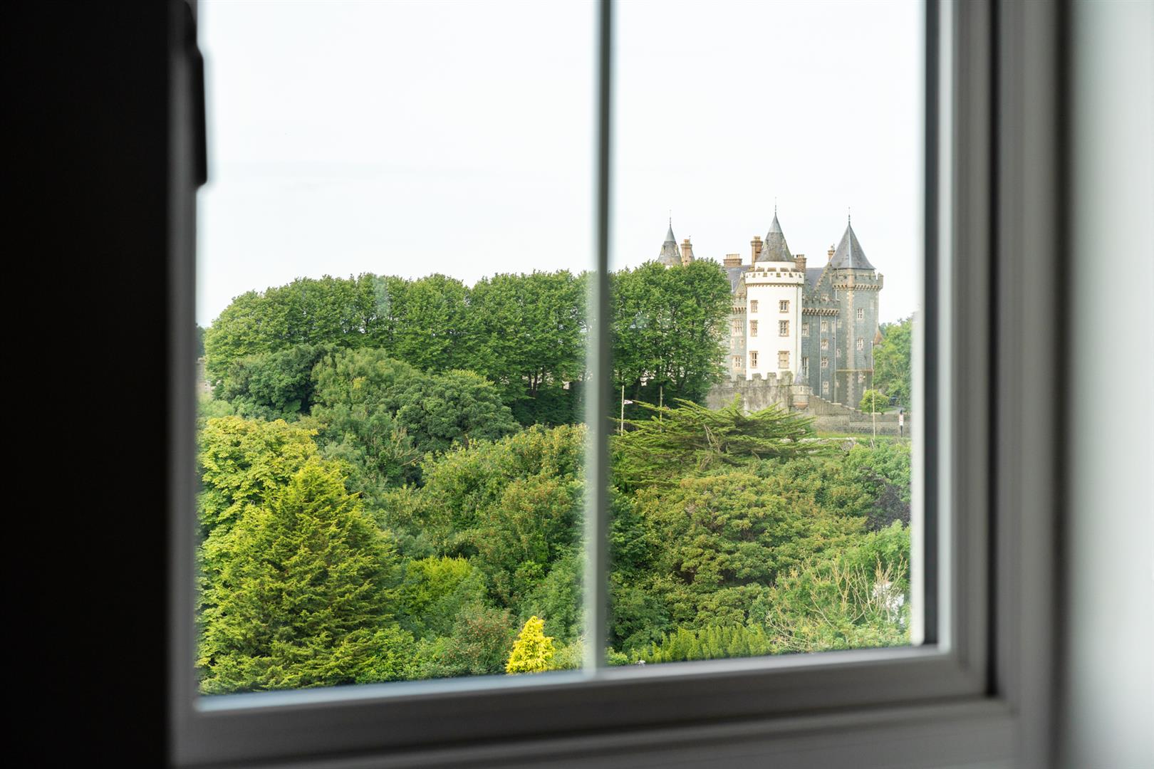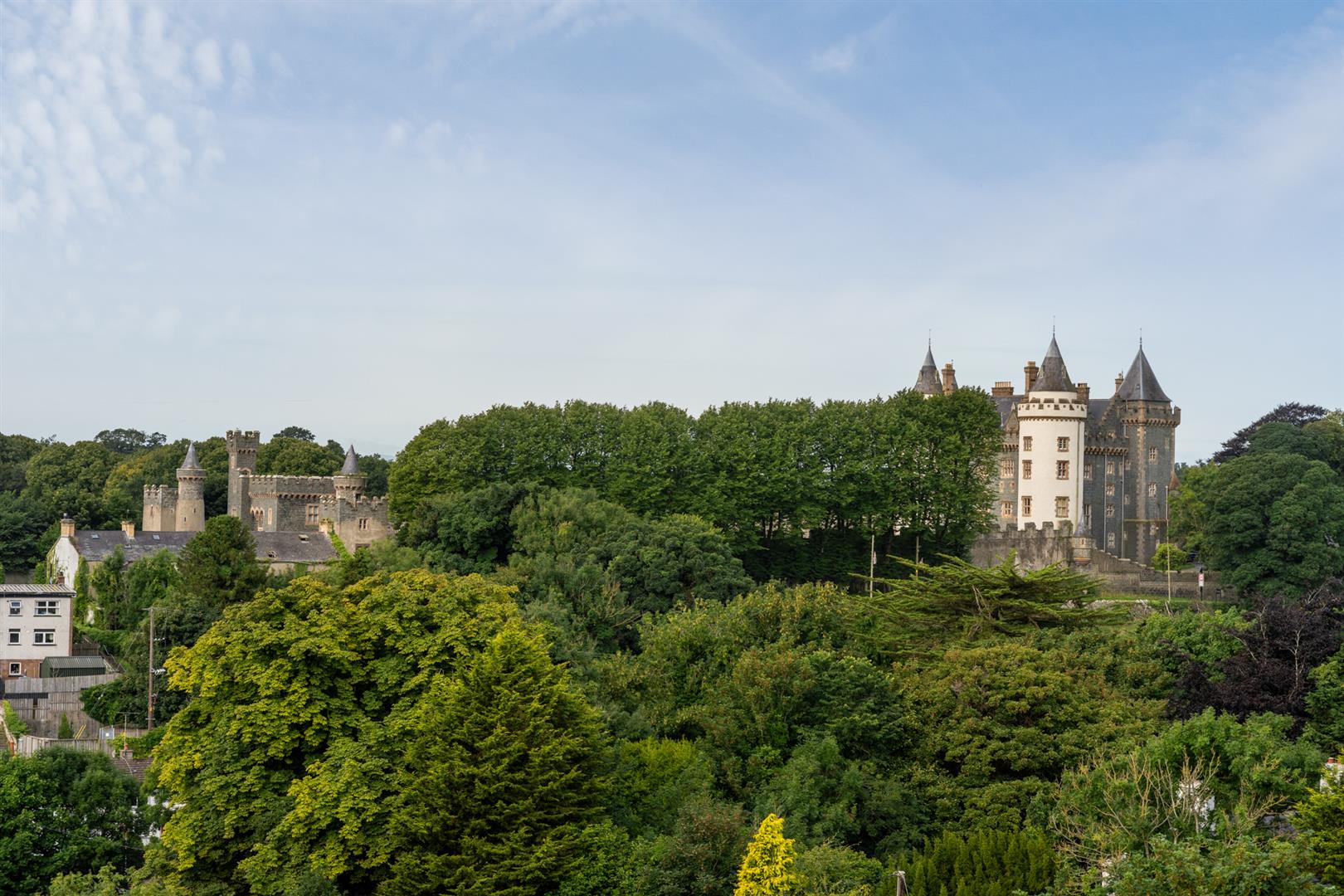 Henley multi fuel stove on tiled hearth. Double aspect windows and view towards Killyleagh Castle.
