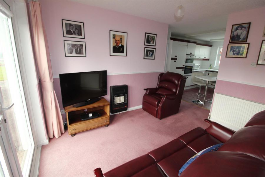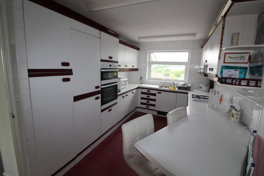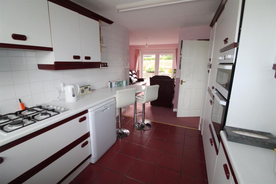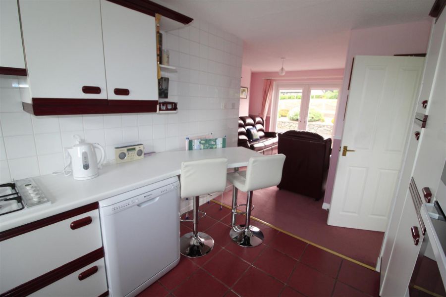 High and low level units with sink unit. Breakfast bar. Integrated fridge/freezer, eye level double oven. 4 ring gas hob. Tiled flooring at kitchen, sitting area with patio doors to rear garden.