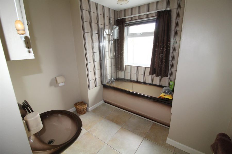 Panelled bath, Electric shower unit, screen door, low flush w.c. and pedestal wash hand basin. Tiled floor. Part tiled walls.
