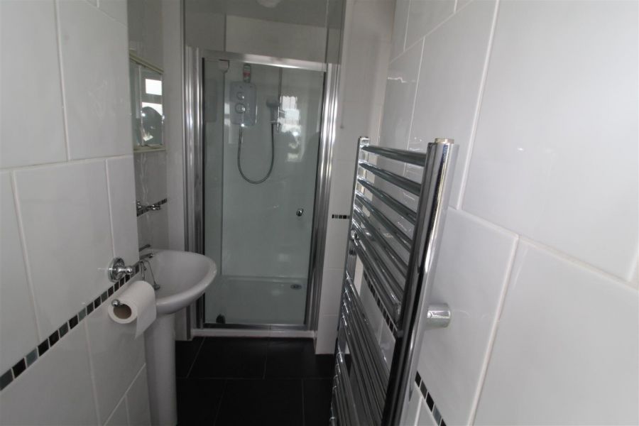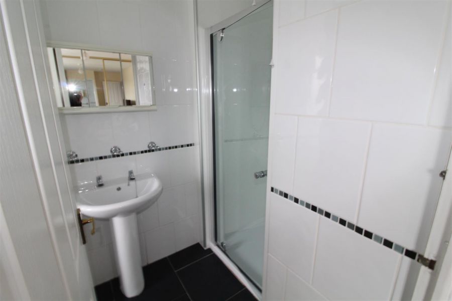 Ensuite with shower cubicle, low flush w..c, and pedestal wash hand basin. Fully tiled.