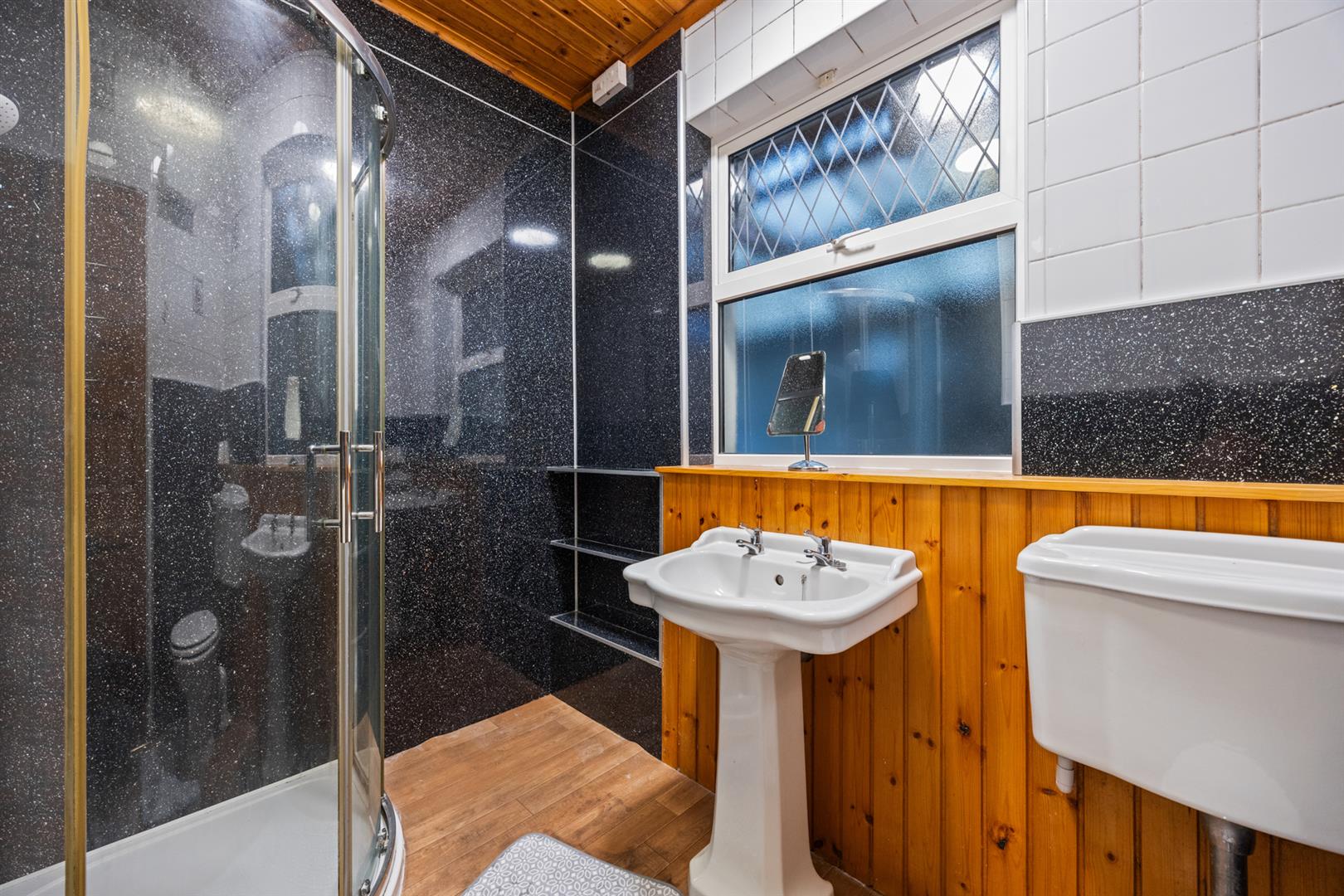 White low flush w.c and pedestal wash hand basin. Corner shower cubicle. Part panelled walls. Part tiled walls. Window to front, door to: