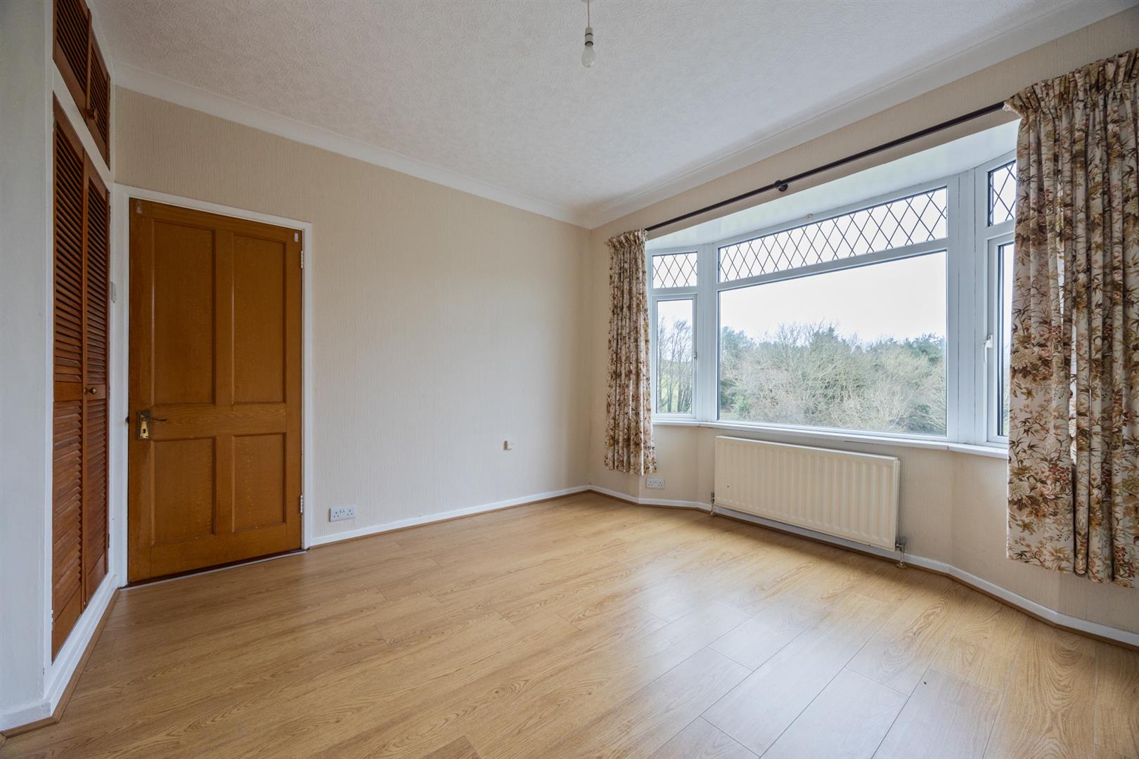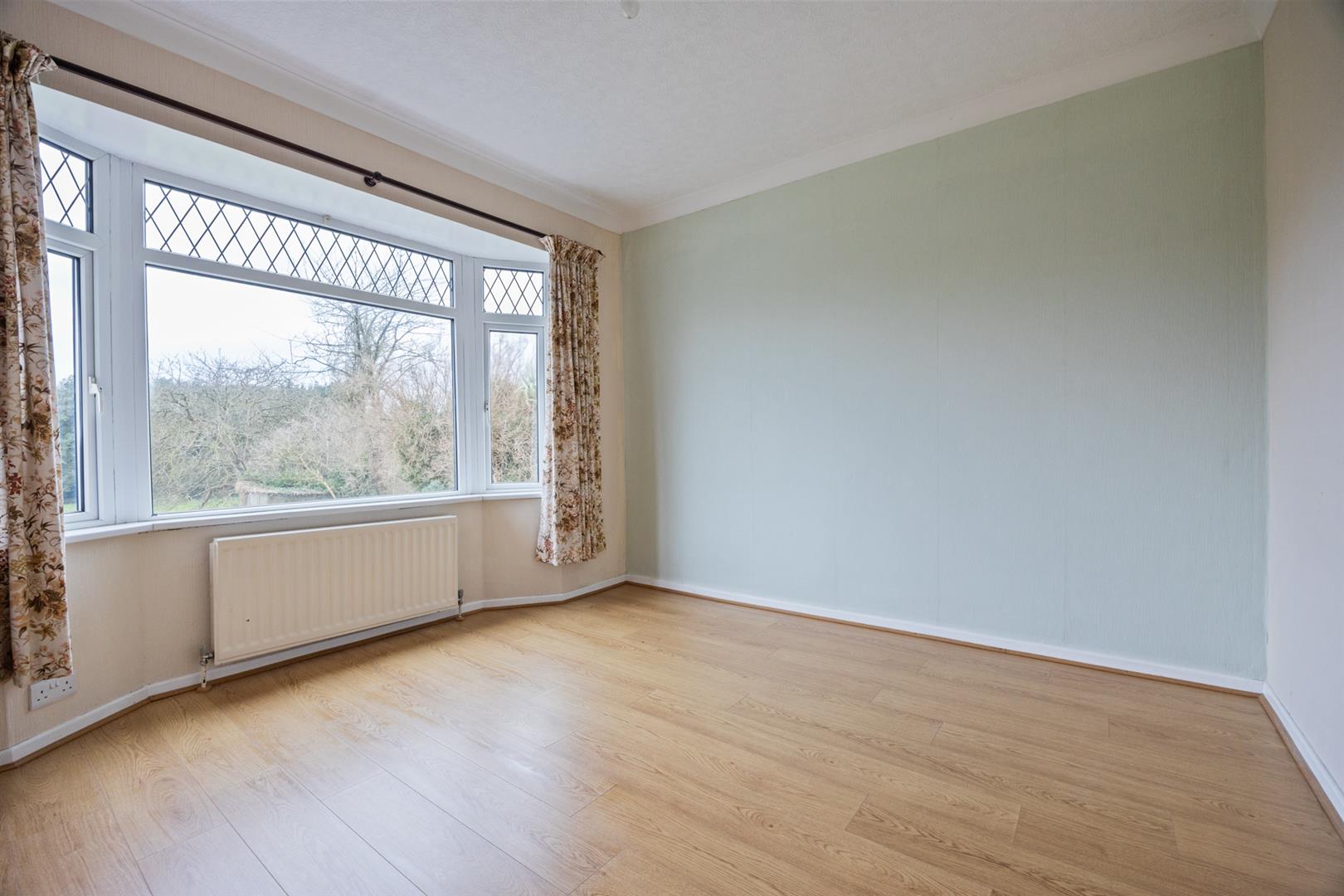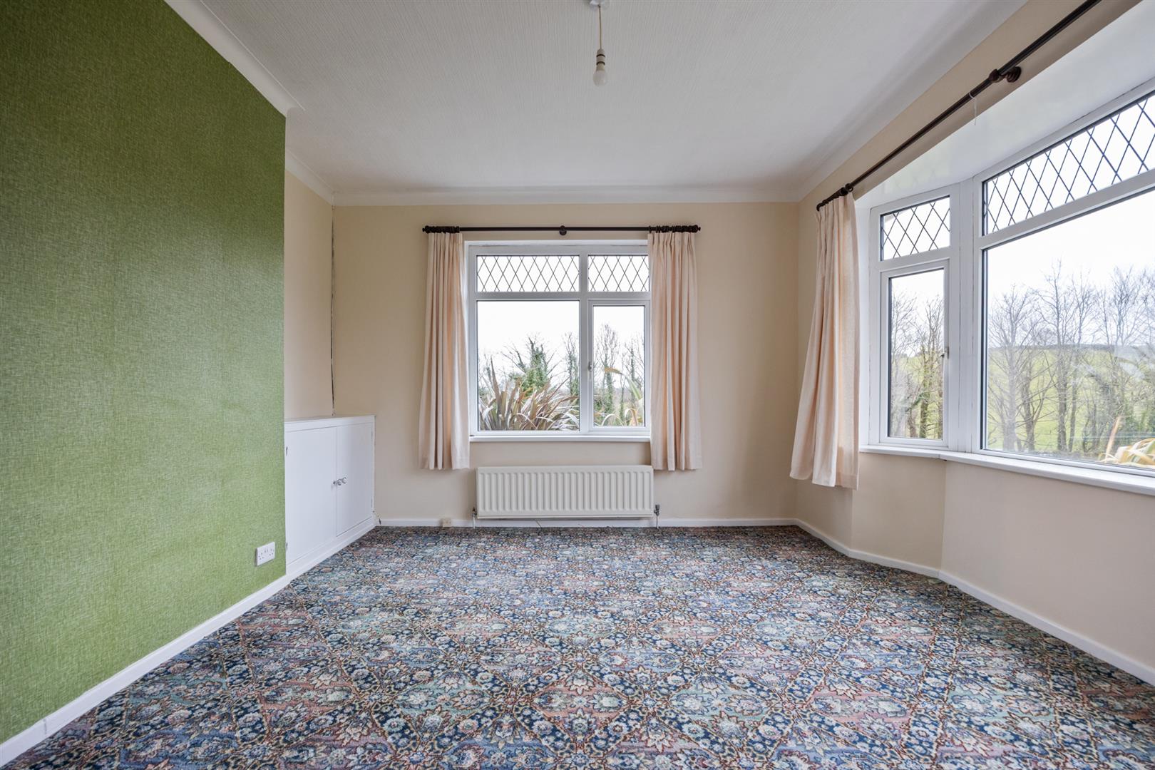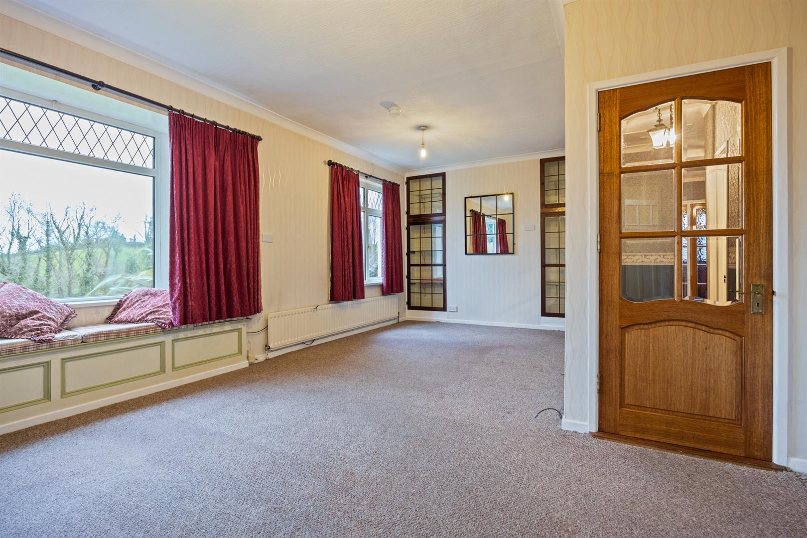 Brick fireplace with electric fire. Window seat. Three windows to side, bow window to side, fireplace, door to: