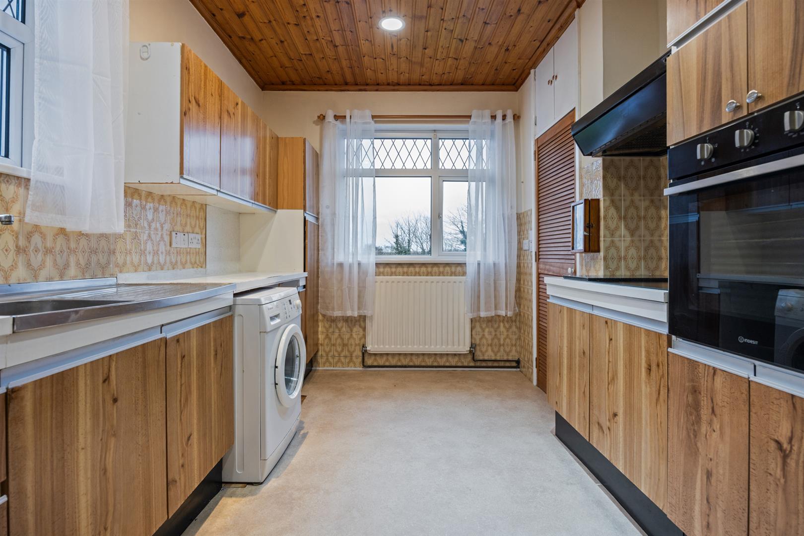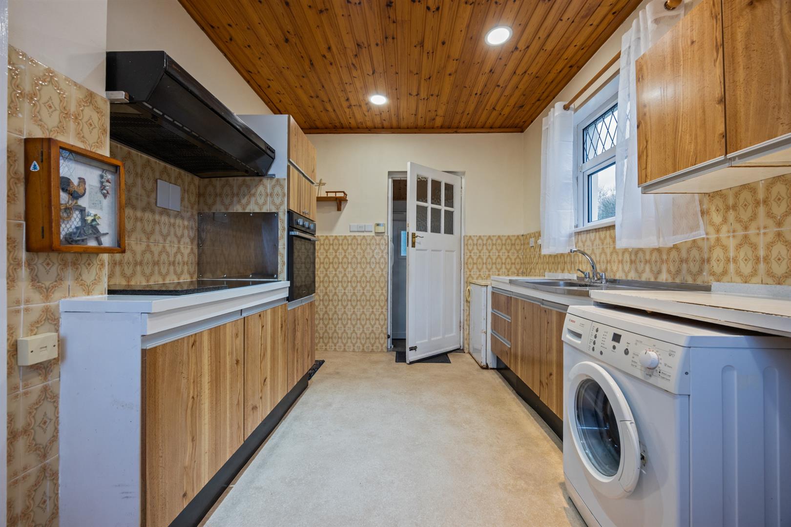 High and low level units with stainless steel sink unit. Eye level oven. Electric hob with extractor fan. Recess for washing machine and fridge. Part tiled walls, Tongue and groove ceiling with spotlights. Window to side, window to front, Storage cupboard, door to: