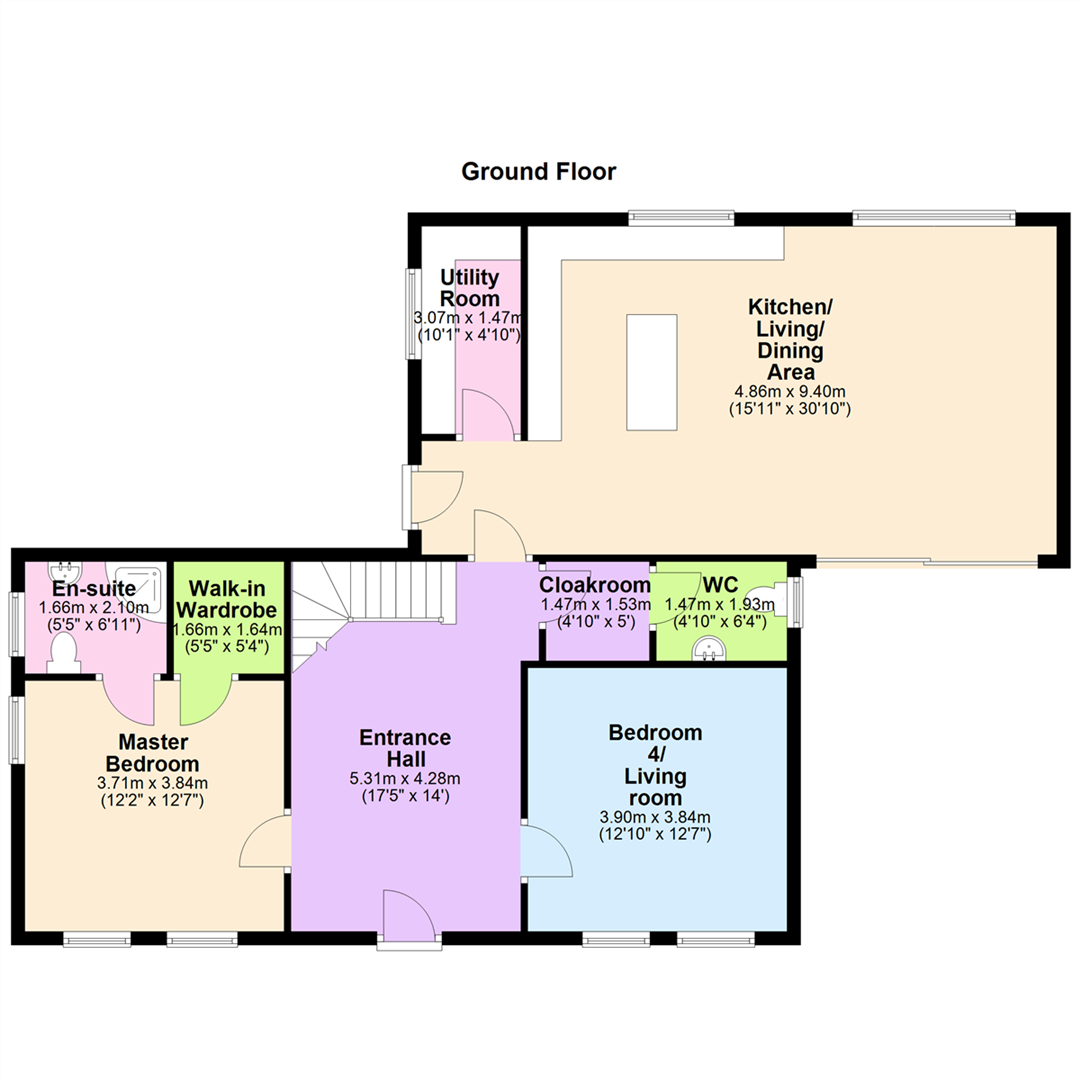The accommodation comprises welcoming entrance hall leading to a spacious open-plan kitchen, dining and living area with separate utility room, Ground floor master bedroom with luxury ensuite and walk-in wardrobe, Downstairs W.C, Versatile bedroom 4 / additional reception room - ideal as a guest room, home office, or snug. On the first floor there are two further well-proportioned bedrooms and a family bathroom