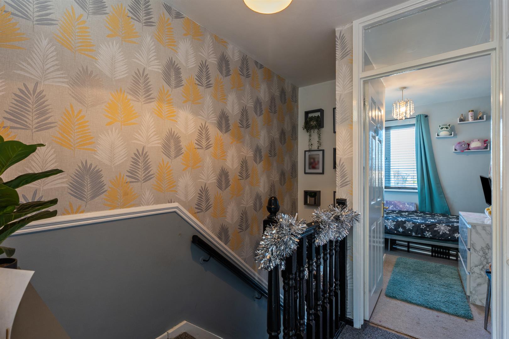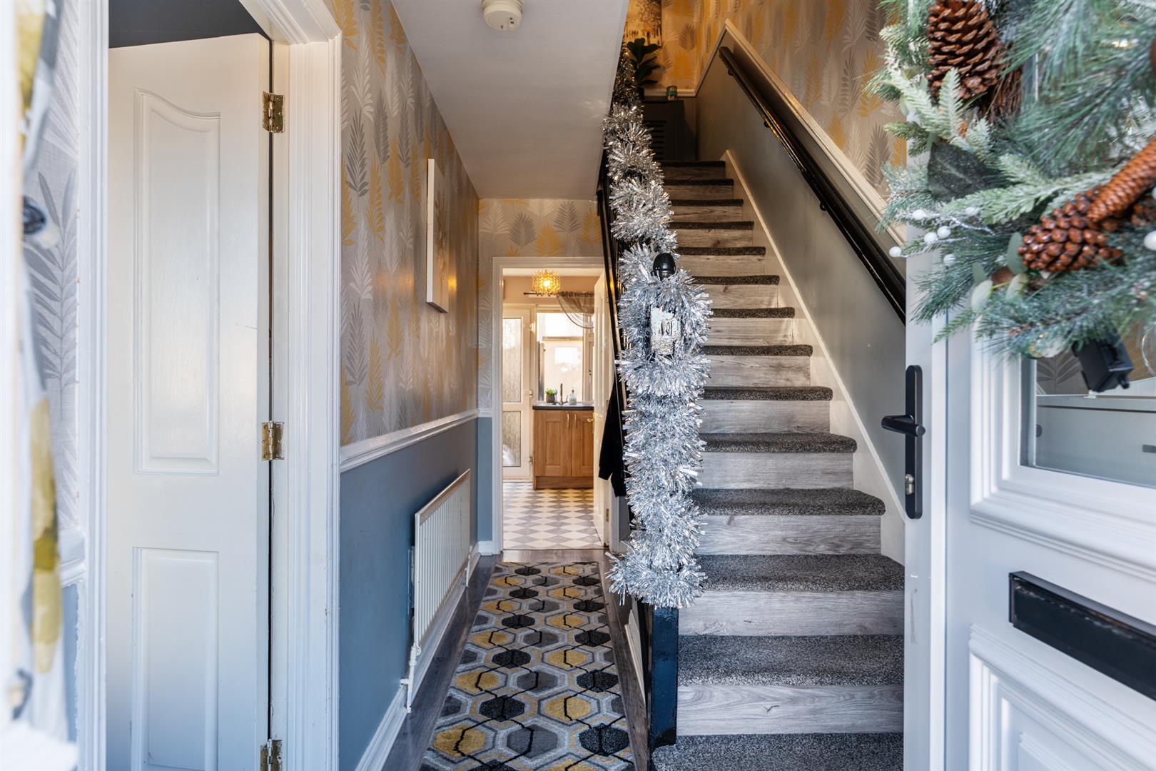Pvc glazed front door to entrance hall with wooden laminate flooring.