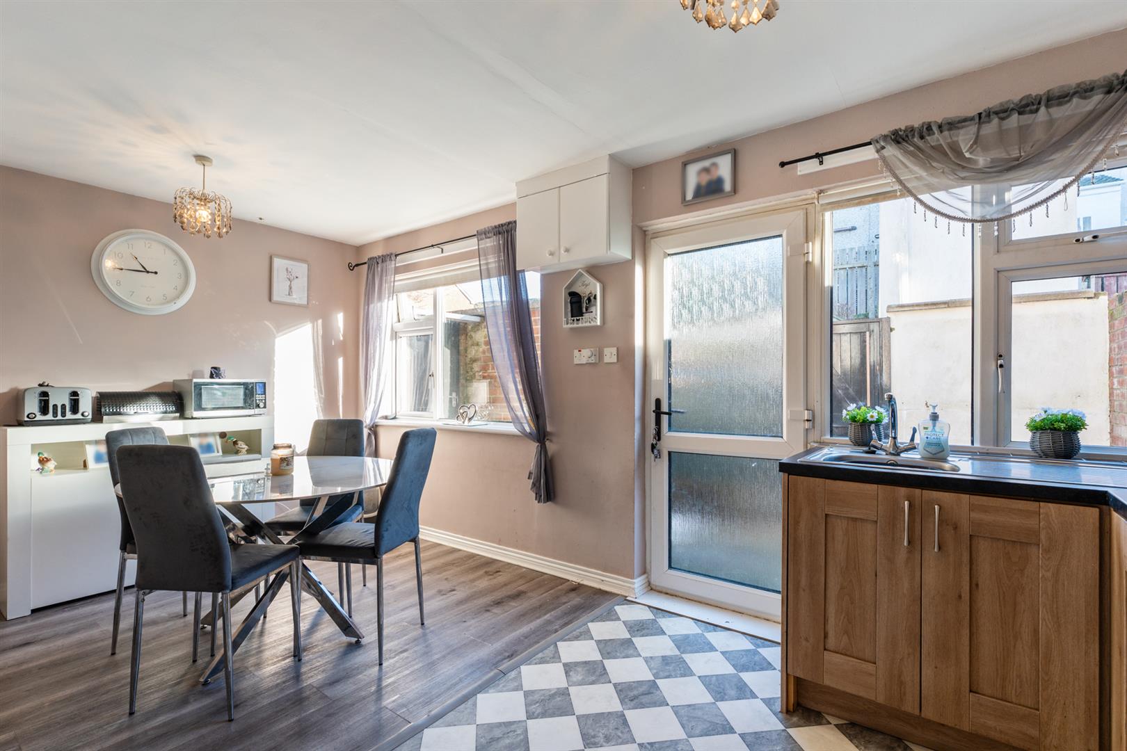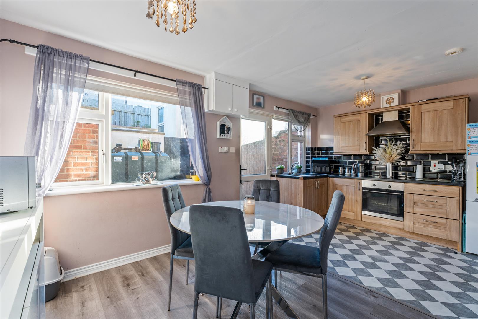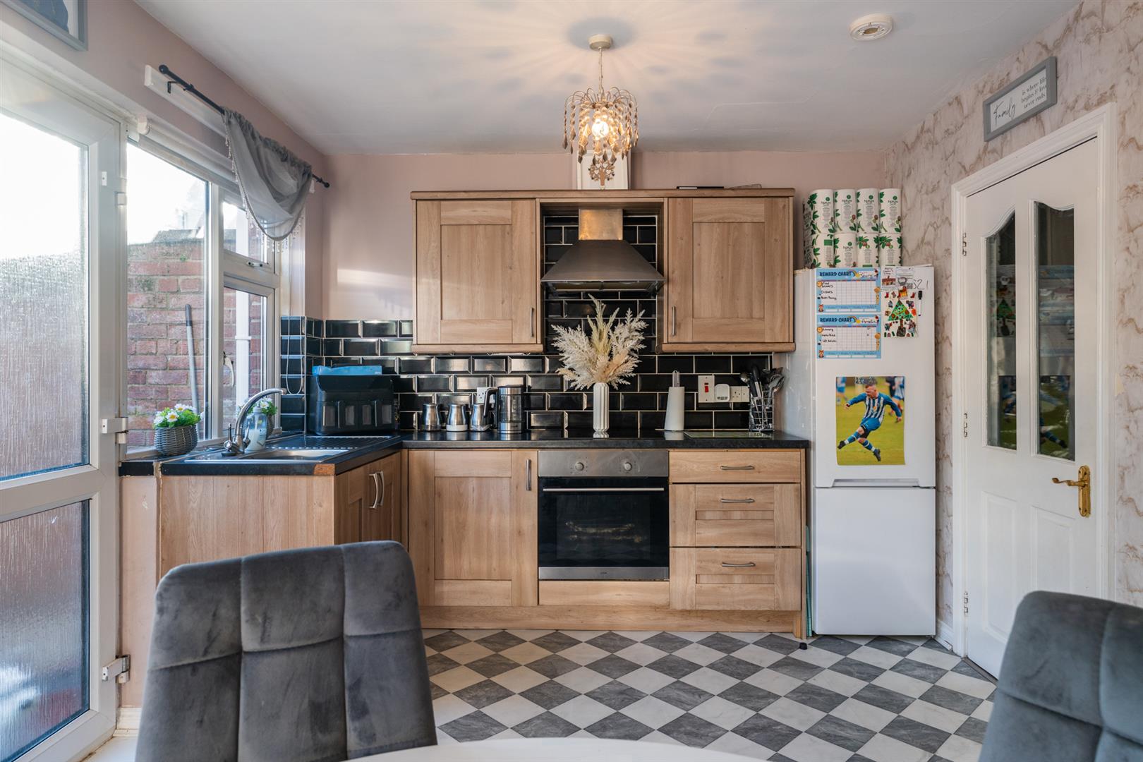 A range of high and low level units including stainless steel sink unit, integrated oven and hob and space for fridge freezer. Door to rear. Tiled splash area.