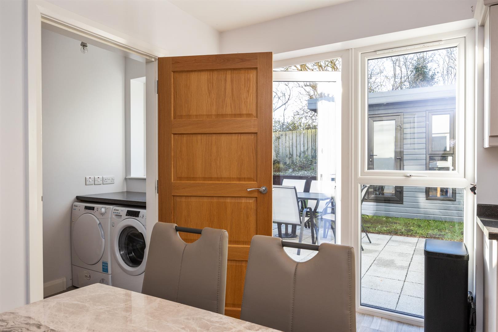 Recess for washing machine and tumble dryer. Window to rear, door to: